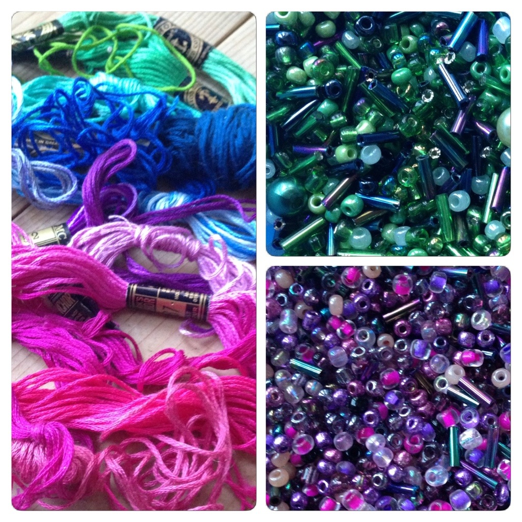 Utöver det plockade jag fram broderitrådar och små glaspärlor och hade lite beslutsvånda innan jag bestämde mig för att kombinera olika gröna och lila till rosa nyanser.