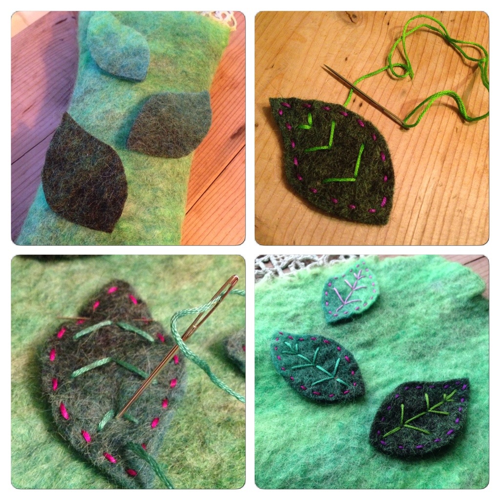 Jag klippte ut bladformer i olika nyanser och sydde längs kanten samt bladnerver i olika färger. Stygnen för mittnerven är det som fäster bladen till handledsvärmarna.