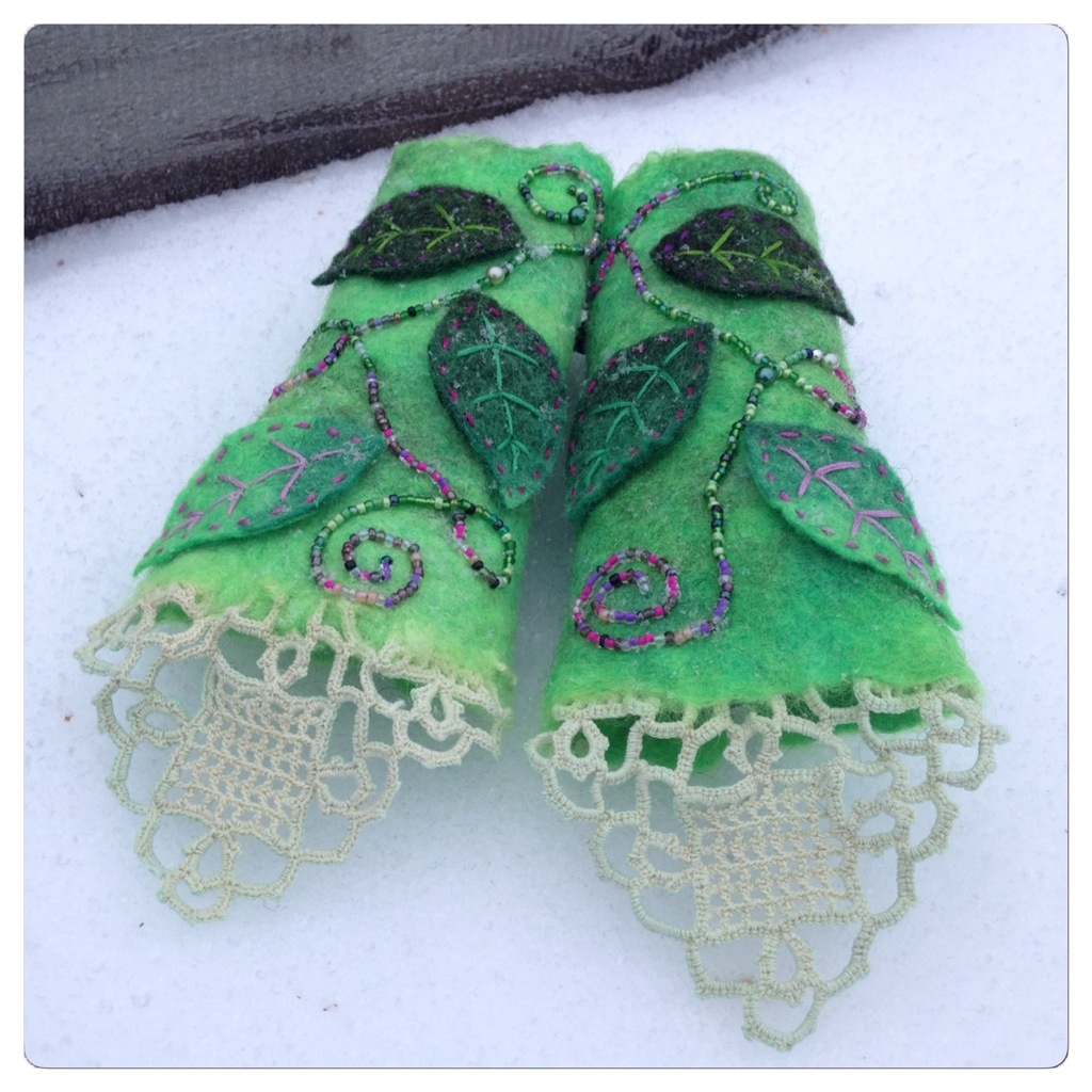 This is what I made with the wool in different shades of green that I wrote about in my previous post. The wool is felted on a loosely woven cotton fabric (to give additional strength) and I also felted on a doily cut in half. I cut out leaves from another felted piece, and decorated and attached these to the handwarmers with embroidery thread. My daugthers threaded beads that I sewed on between the leaves. To make the wrist warmers adjustable in size, I chose to use a strap that can be tightened and tied on the inside of the wrist.