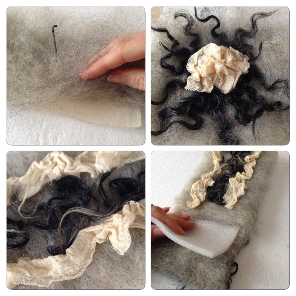 Jag la ut ullen i tre lager på tyget och tog några tag med tovningsnålen innan jag svepte det runt skumplasten. Sedan kände jag mig äventyrslysten och la ut både lösa lockar och remsor av bommullstyget (fuktade och ihopskrynklade).