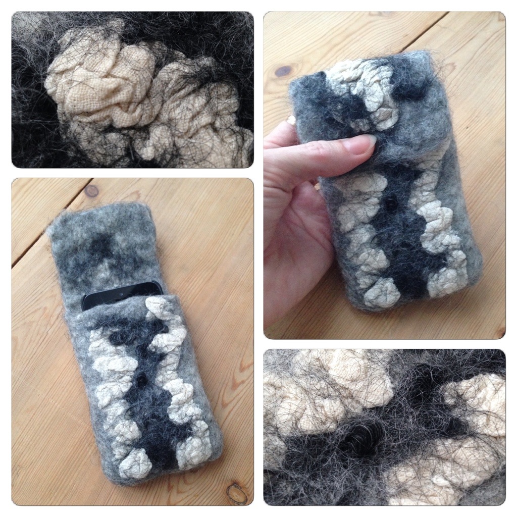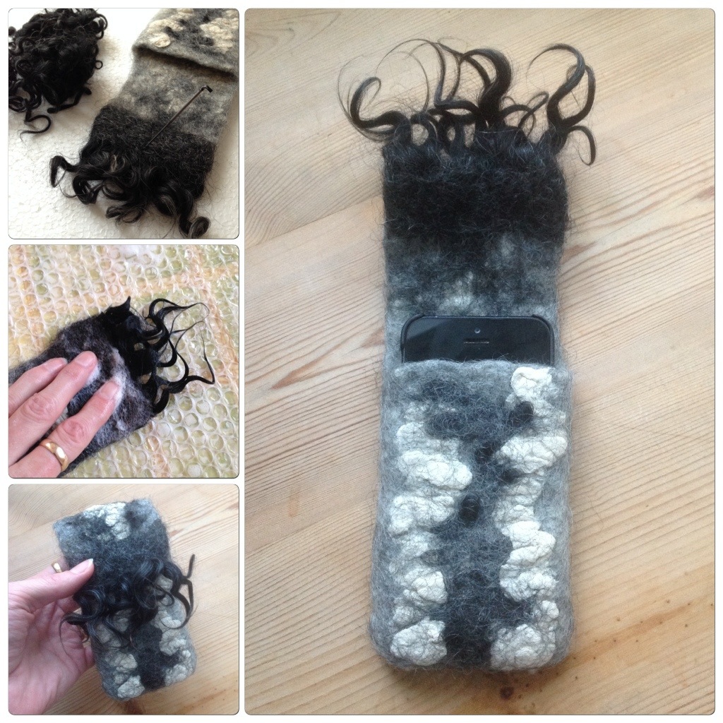 Ja, så hade jag ett mobilfodral, med hårt fasttovade lockar och tygremsor. Det resulterade visserligen i en mer intressant ytstruktur än bara en slät tovad yta, men den kändes lite tam när alla lockar tovats fast…