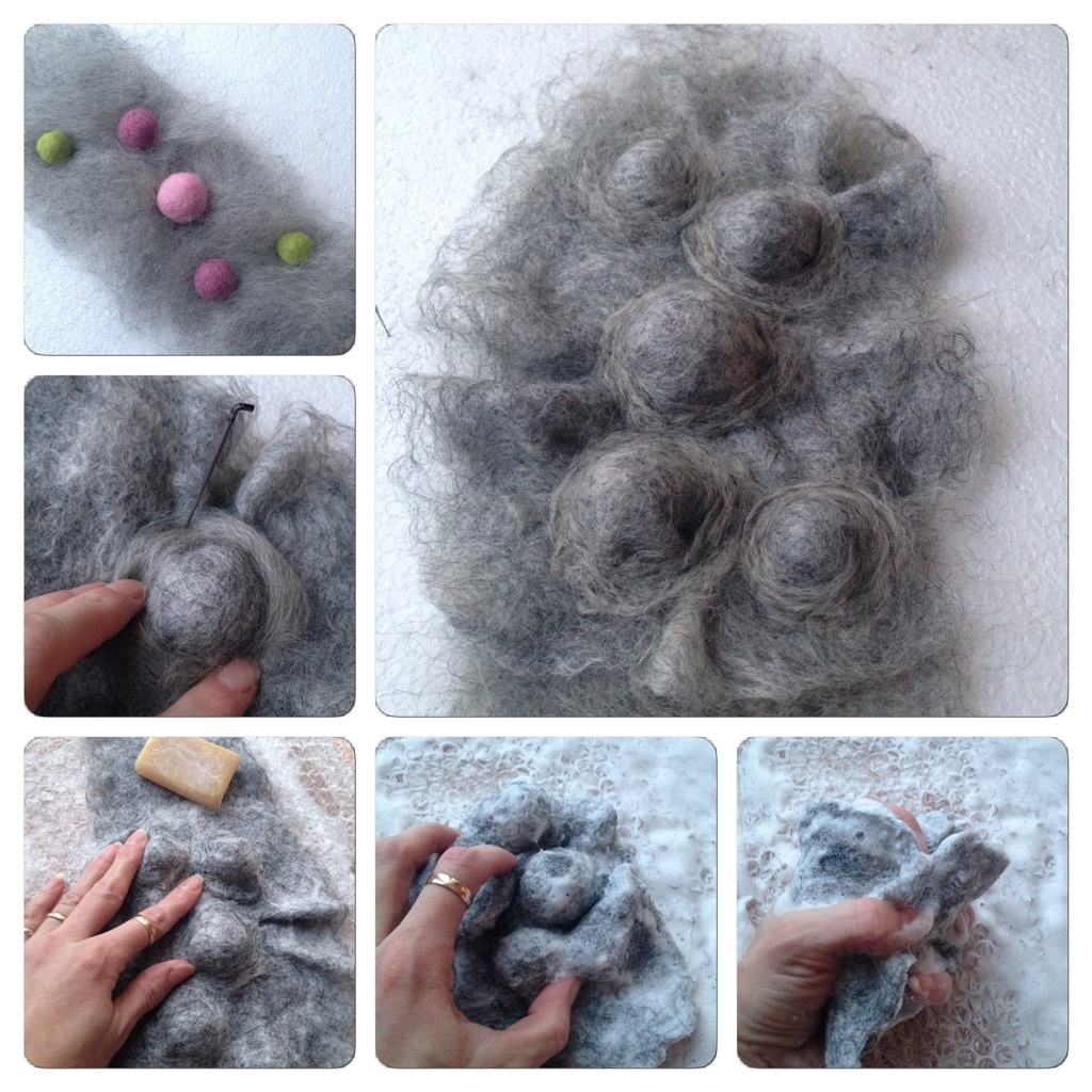 Jag la kulorna mellan de två tovade styckena, tillsammans med lite mer kardad grå ull och började med att nåltova lite runt kulorna. Sedan våttovade jag alltihop med varmt vatten och såpa.