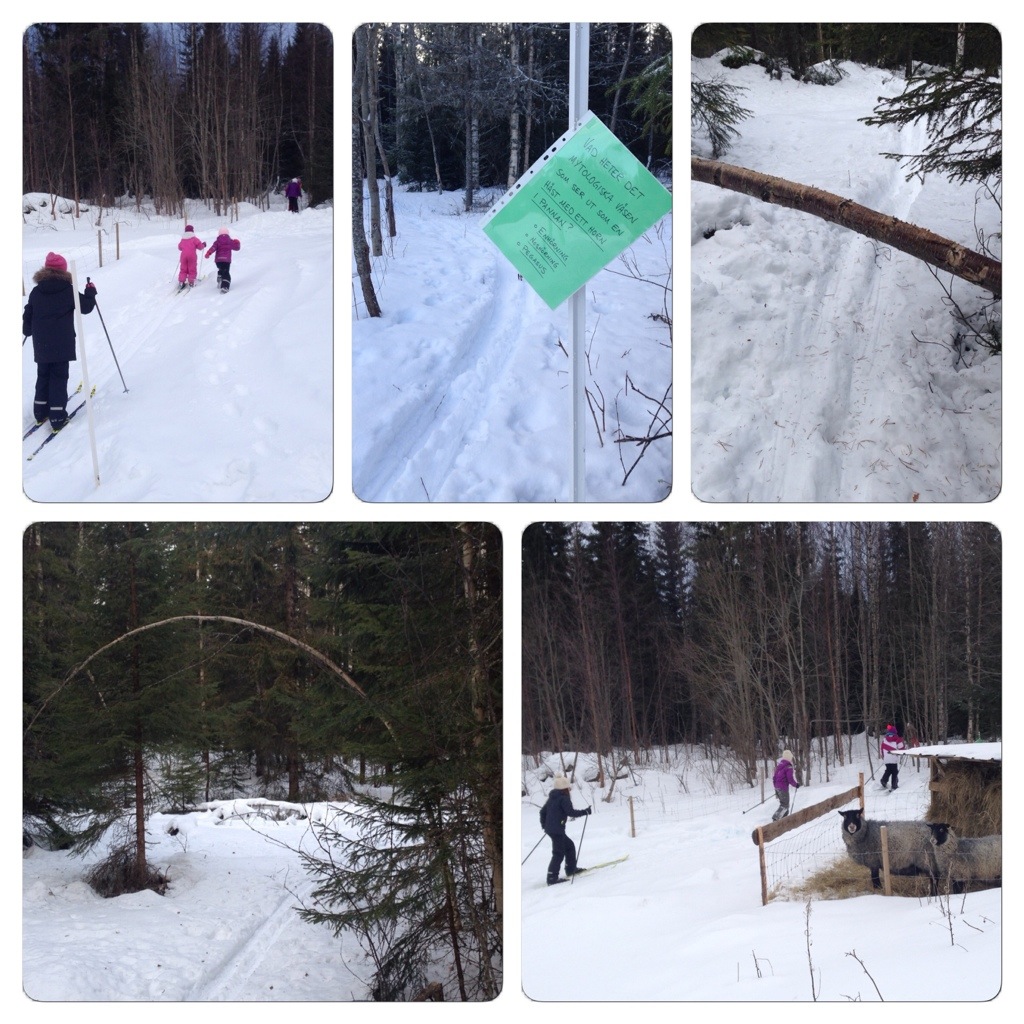 Den sista aktiviteten inbegrep skidåkning längs ett spår vi dragit upp i skogen. Längs spåret fanns ett antal skyltar med frågor (givetvis relaterade till ridning, hästar eller enhörningar) med tre svarsalternativ. Under snötyngden hade dessutom flera björkar böjts ned till naturliga valv och hinder att åka under, vilket gjorde det till lite av en äventyrsbana (särskilt för undertecknad som inte är särskilt smidig på skidor…).