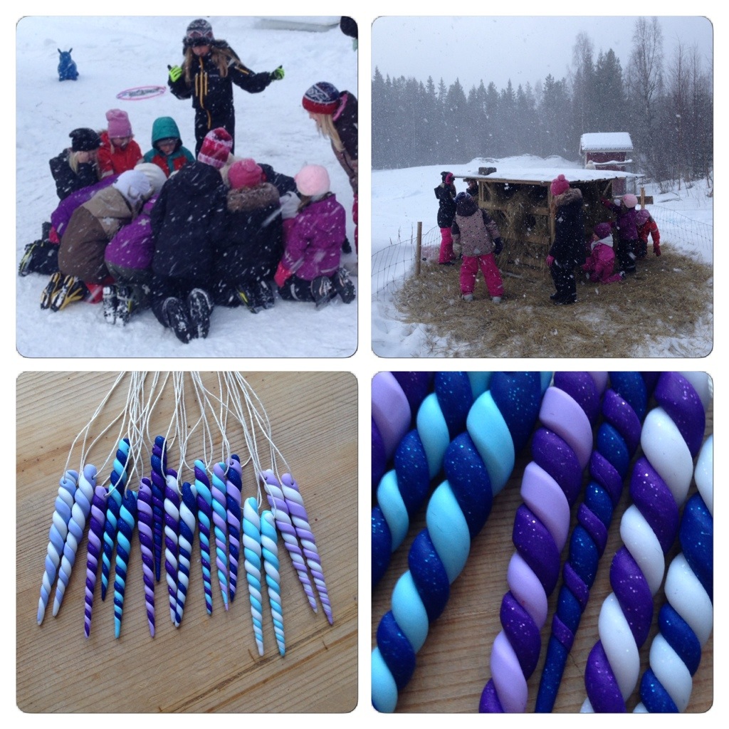 Finally, they all got to ski a trail in the forest, with birches bent from the snow creating natural arches and obstacles along the way. Here we had questions posted (all related to riding, horses or unicorns), with three alternative answers. When everyone was back from the trail, we went through the questions, and the first letter of each correct reply was a letter they should use to make a word. That clue, in turn, lead them to the hay in the sheeps’ winter enclosure. The sheep seem convinced that the best hay is in the middle, which means the are lots of holes in the hay which are perfect for hiding treasures in. In this case, a metal box with ”magical unicorn horns”, one for each child. These I made from clay that can be hardened in the oven. Luckily, I had clay with glitter, so they must be magical. 😉