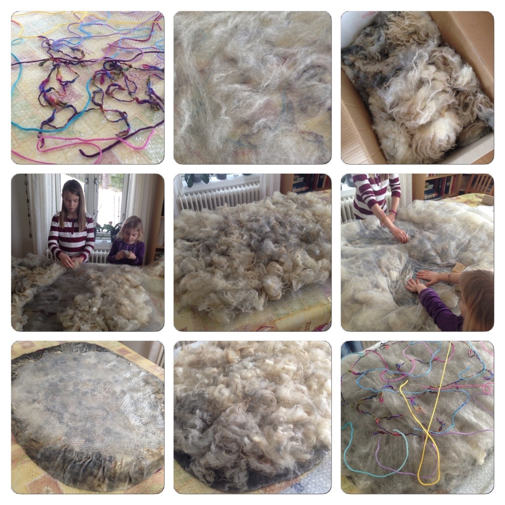 Vi började med att lägga ut bitar av färgglatt garn och på det ett lager kardad Gotlandsull. Sedan la vi på ett lager råull från vår Åsenbagge, som vi bara tesade lite. Allt blöttes ned och sedan gnuggade vi in lite såpa. På det la vi ut en bit bubbelplast, klippt i en rundad form (ca. 100cm x 80cm), och vek upp ullen längs kanten. Sedan gjorde vi om samma procedur fast baklänges. Tesad råull, kardad ull och garn. Blötte ned, gnuggade in såpa och vek den överskjutande ullen runt kanten på mallen av bubbelplast.