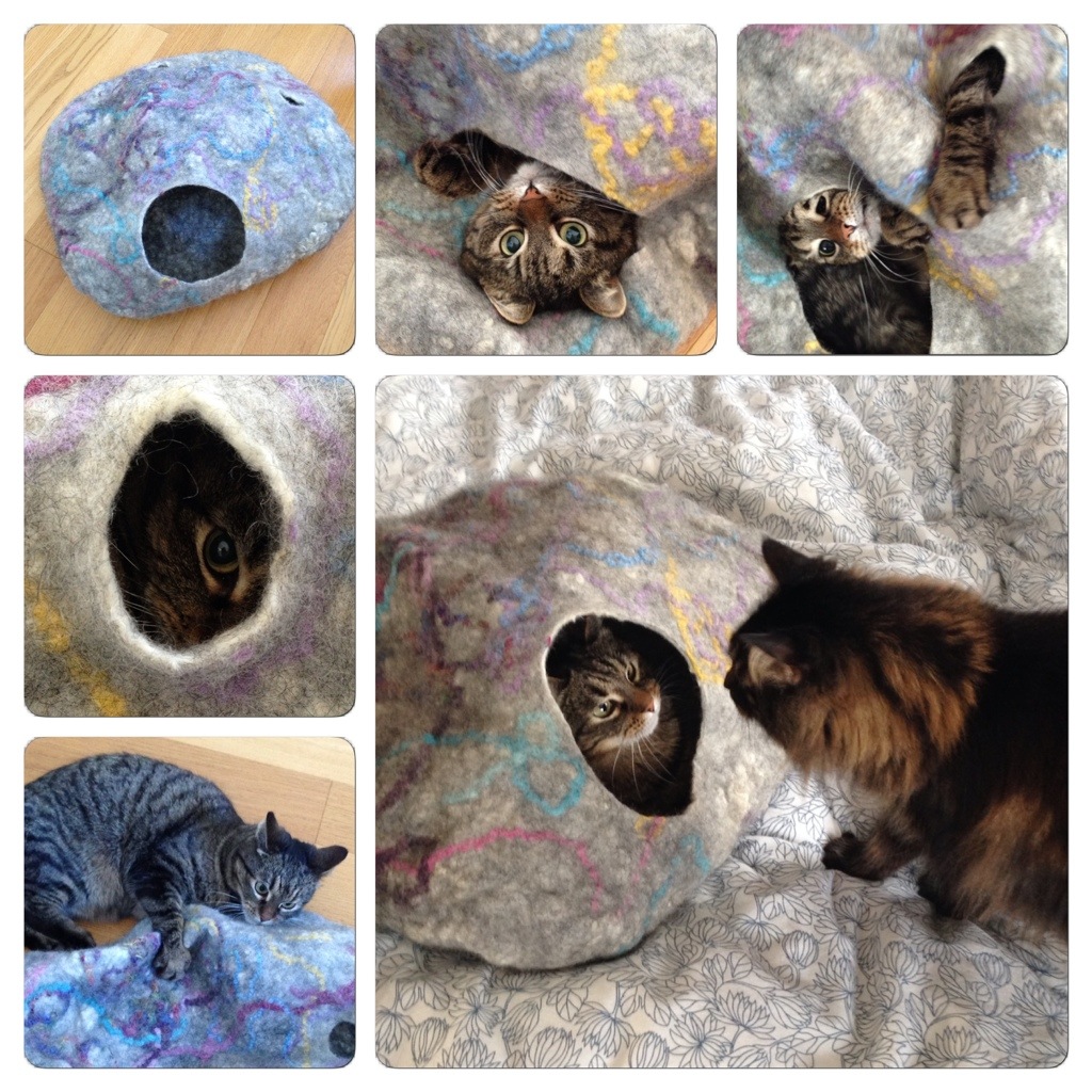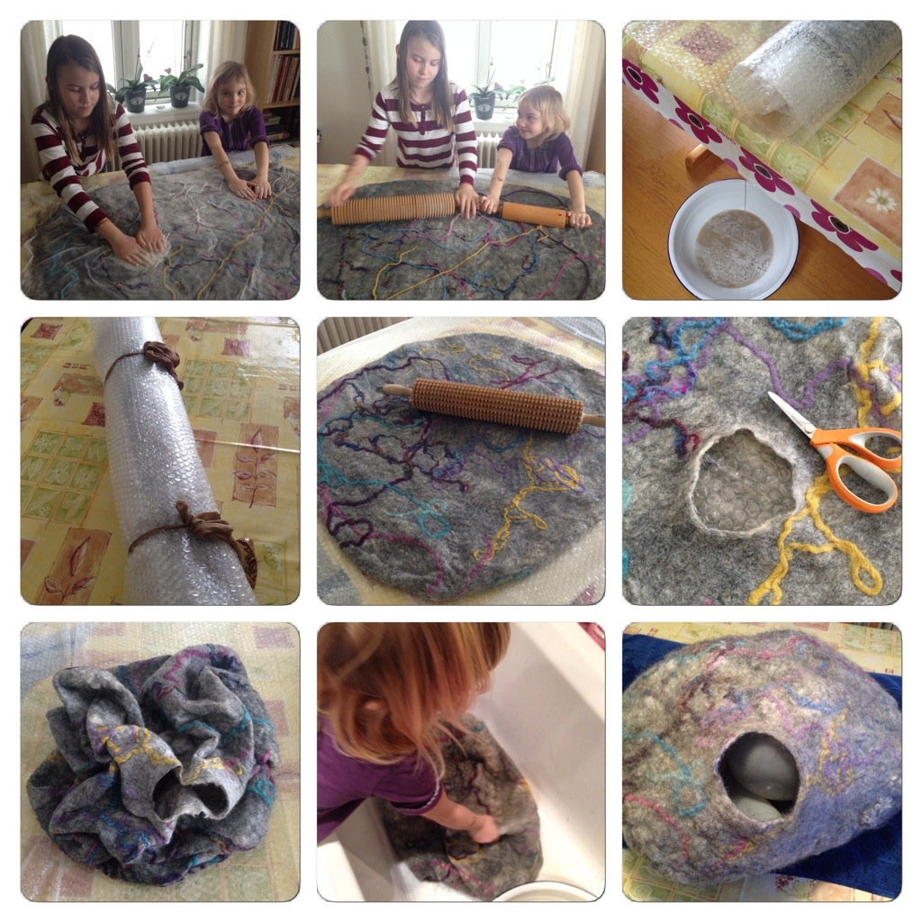 Nu under sportlovet passade barnen och jag på att tova lite. Vi var helt eniga om att katten behövde en tovad grotta. Vi har visserligen två katter, men den ena, Smilla, är särdeles förtjust i fårull och att krypa in i små utrymmen. Det var alltså henne vi hade i åtanke.