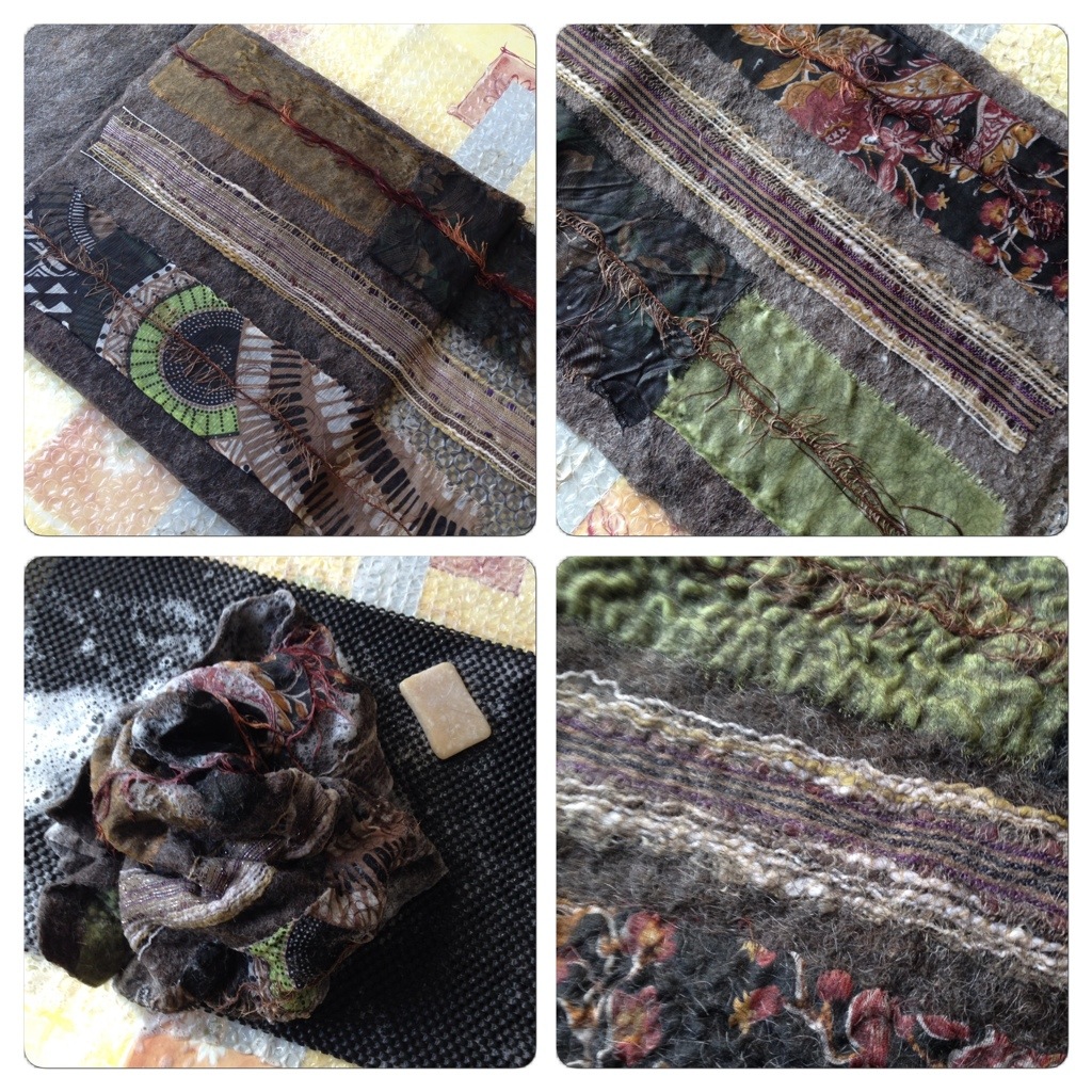Jag valde att blöta ner ullen för sig och svepa den runt mallen innan jag la dit tygbitarna. Sedan följde masserande, rullande och knådande tills väskan krympt en tredjedel i storlek och tygbitarna tovats in och skrynklats ihop av ullen.