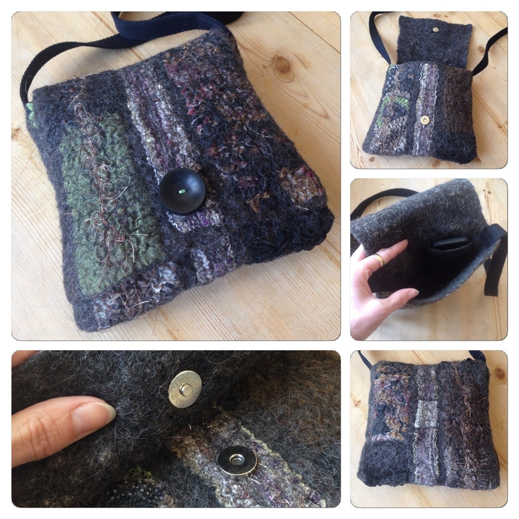 När väskan torkat tillkom en axelrem, ett magnetlås och en stor knapp på locket. Jag gillar den här storleken på väska och den tovade innerfickan är precis lagom för en mobil. Den här blir nog riktigt användbar.