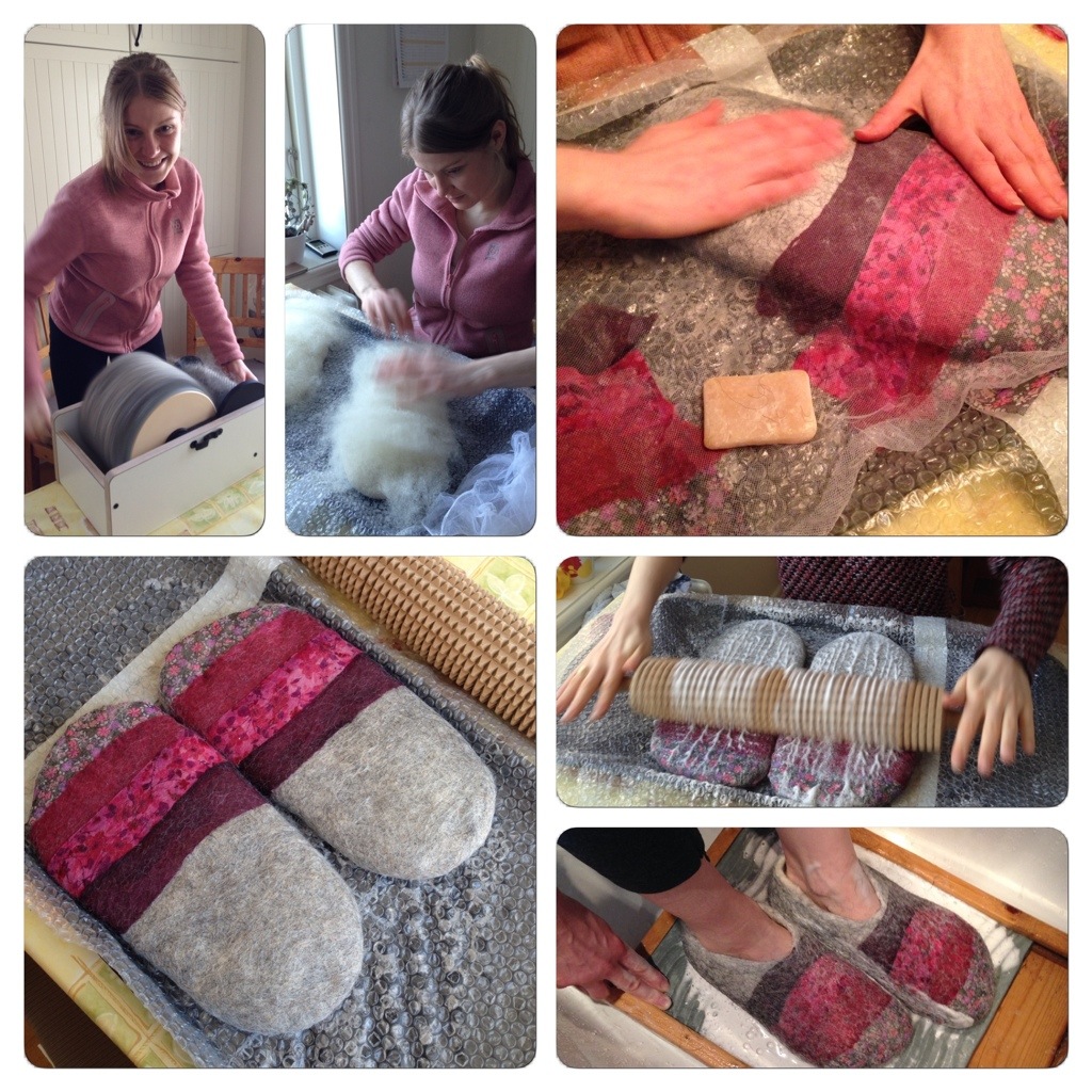 Givetvis fick hon en snabbkurs i tovning också. Eftersom hon numera bor i England beslöt vi att hon behövde ett par tofflor. Hon fick börja från grunden med att karda ull, rita och klippa ut mallar. Sedan la hon ut flera lager ull och valde några tyger att tova in (s.k. nunotovning) för att få lite färg. Den slutliga valkningen och formgivningen gjordes i badkaret på en tvättbräda.20150410-132911.jpg