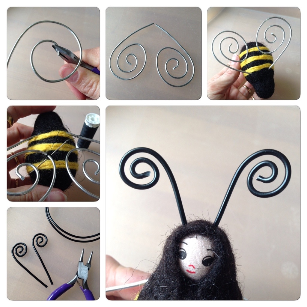 På det andra biet limmade jag fast en flörtkula med ett målat ansikte. Runt flörtkulan nåltovade jag fast en bit tovad ull, lite som en huva. Vingarna och antennerna gjorde jag av aluminiumtråd.