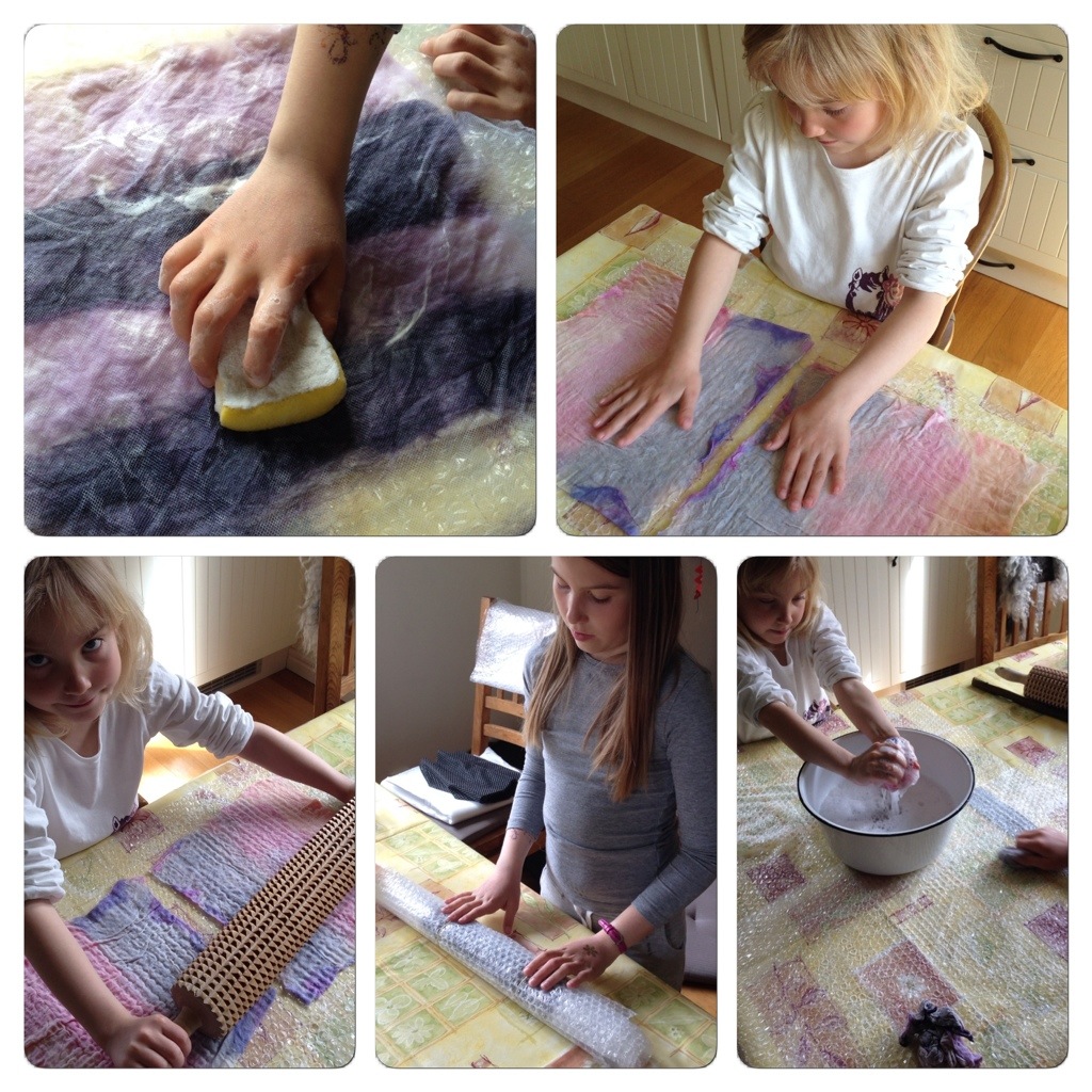 Sedan fick de blöta ner allt med en tvättsvamp och massera, kavla, rulla och knåda. Det sista steget, att omväxlande doppa dem i kallt och varm vatten, och slänga dem mot botten av badkaret för att chocka fibrerna, är fortfarande en favorit. Enligt min yngsta fungerar det bäst om man inte talar om det för ullen innan. Då blir den riktigt förvånad och drar ihop sig ordentligt. 😉
