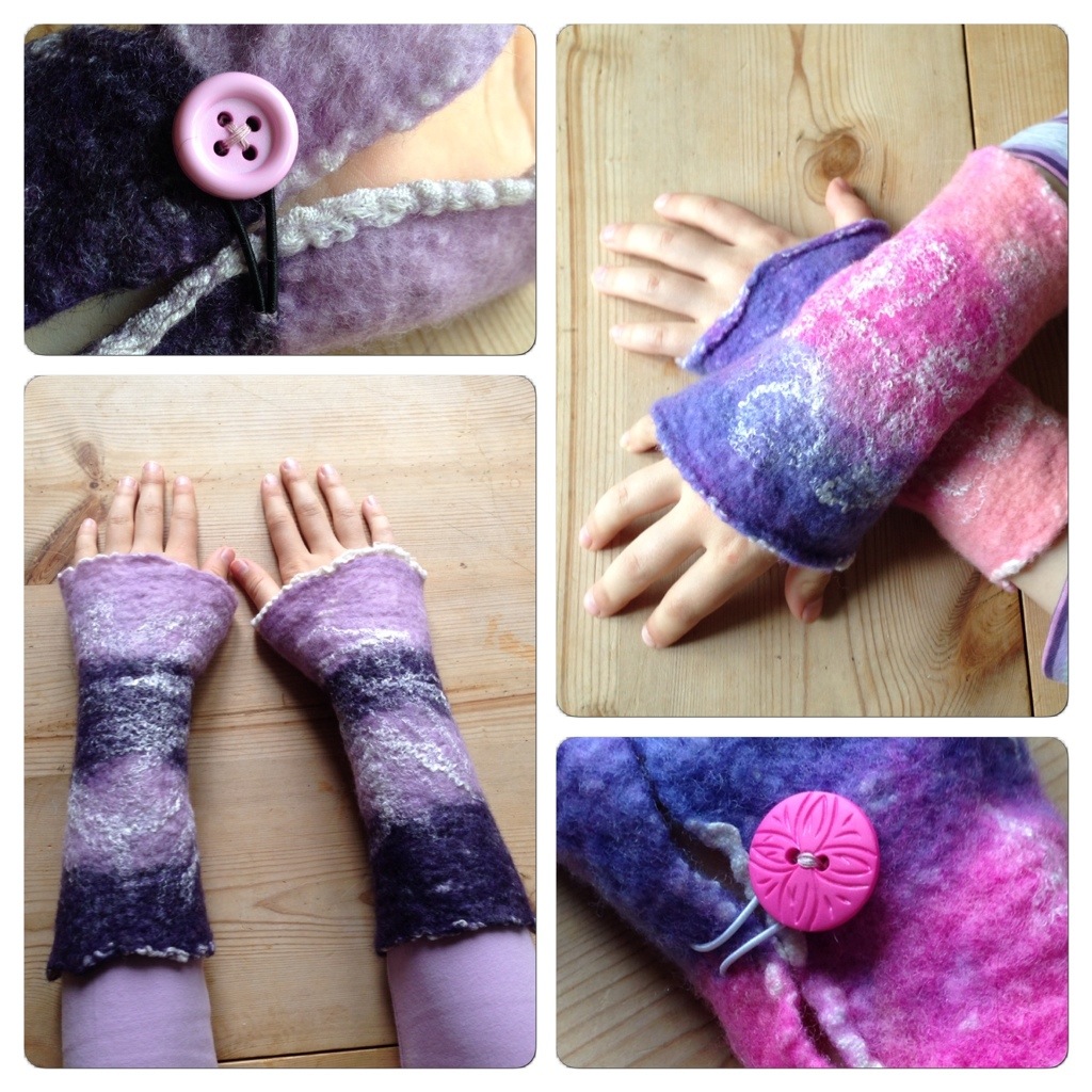 My daugthers have been eyeing the soft merino wool, in pink and purple, for some time. So last weekend I let them make wrist warmers. They did everything themselves (under my supervision), from layout of wool and silk fibres on cotton fabric, to rubbing and rolling. The last stage, consisting of alternating between hot and cold water, and throwing them in the bathtub to chock the fibrers, is still a favorite. Accordning to my youngest, it works best if you don’t tell the wool what it going to happen. Then it gets really surprized and shrinks the most. 😉