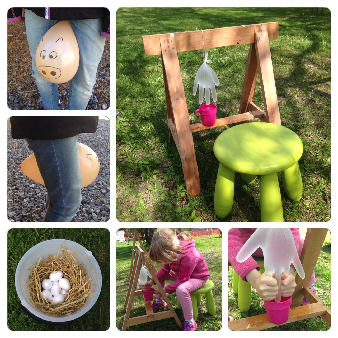 Efter det var det dags för en stafett där barnen fick rida på en gris (= springa med en ballong mellan knäna), mjölka en ko (=gummihandskar med vatten i, och hål gjorda med en knappnål i fingerspetsarna) samt hämta ett ägg (av frigolit). Ridandes på sin ”gris” skulle de sedan ta sig tillbaka med ”mjölken” och ägget, och sedan var det nästa barns tur. Tillsammans skulle de få ihop minst 1 dl mjölk och just mjölkandet var populärt. (Bilderna nedan är tagna dagen före, i solsken, då vi testade banan).