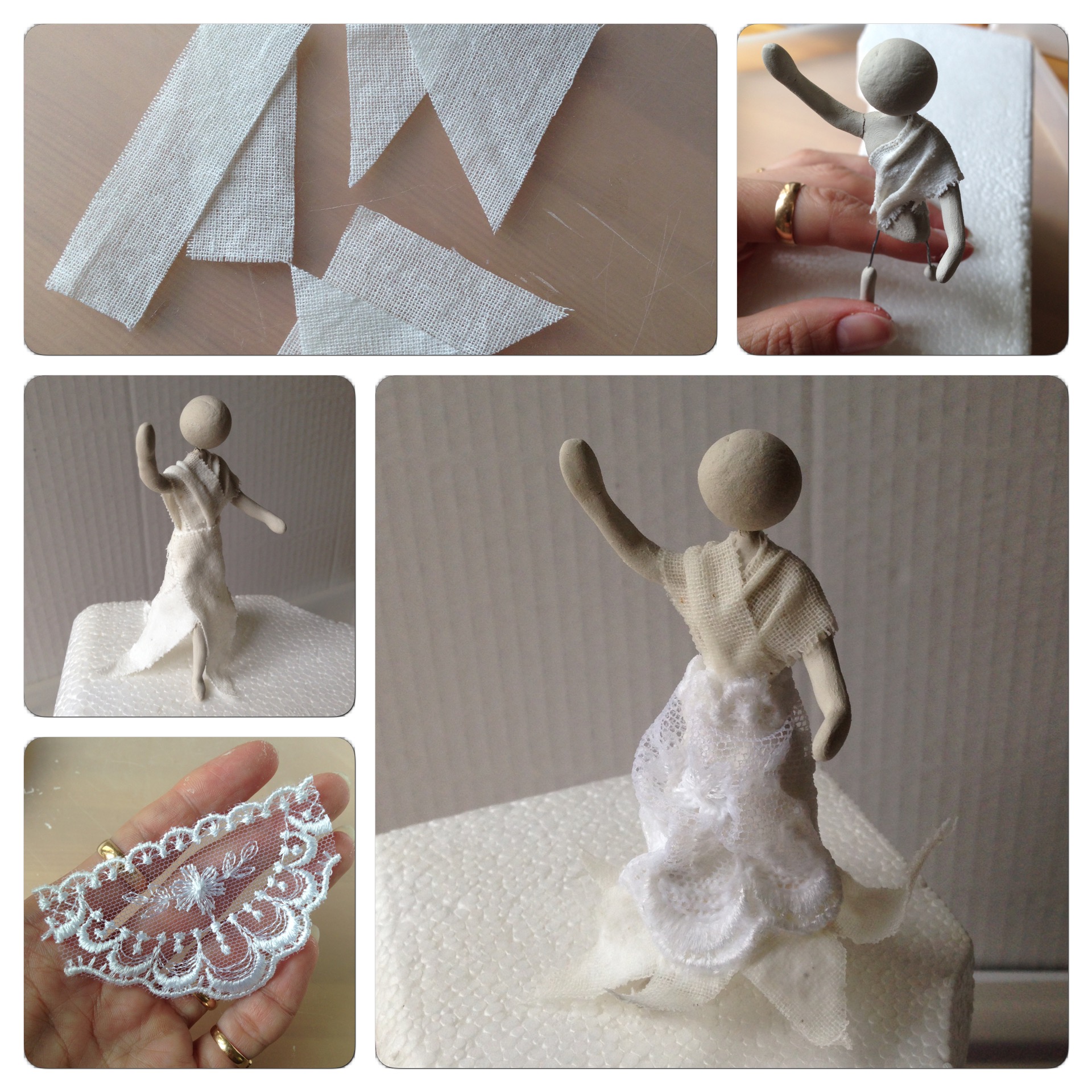 För att få till proportionerna någorlunda började jag med att rita en streckgubbe som passade vingarna i storlek. Utifrån det gjorde jag en stomme av ståltråd som jag byggde på med lera. Den här leran är riktigt trevlig att jobba med. Den känns precis som riktig lera men lufttorkar och behöver alltså inte brännas för att härdas. Eftersom den börjar torka ganska snabbt hade jag en liten skål med vatten framme som jag fuktade fingrarna med under tiden jag jobbade med leran. Sedan var det bara att låta den stå över natten för att torka. Efter det var det dags att testa Paverpol, ett skulpturlim som bl.a. används för att skulptera med tyg. Jag klippte ut några remsor och trianglar av tyg samt en bit spets, kletade in limmet (jo, det är väldigt kletigt) i tygbitarna och draperade figuren. Det blir stenhårt när det torkat och ska tåla att stå utomhus.