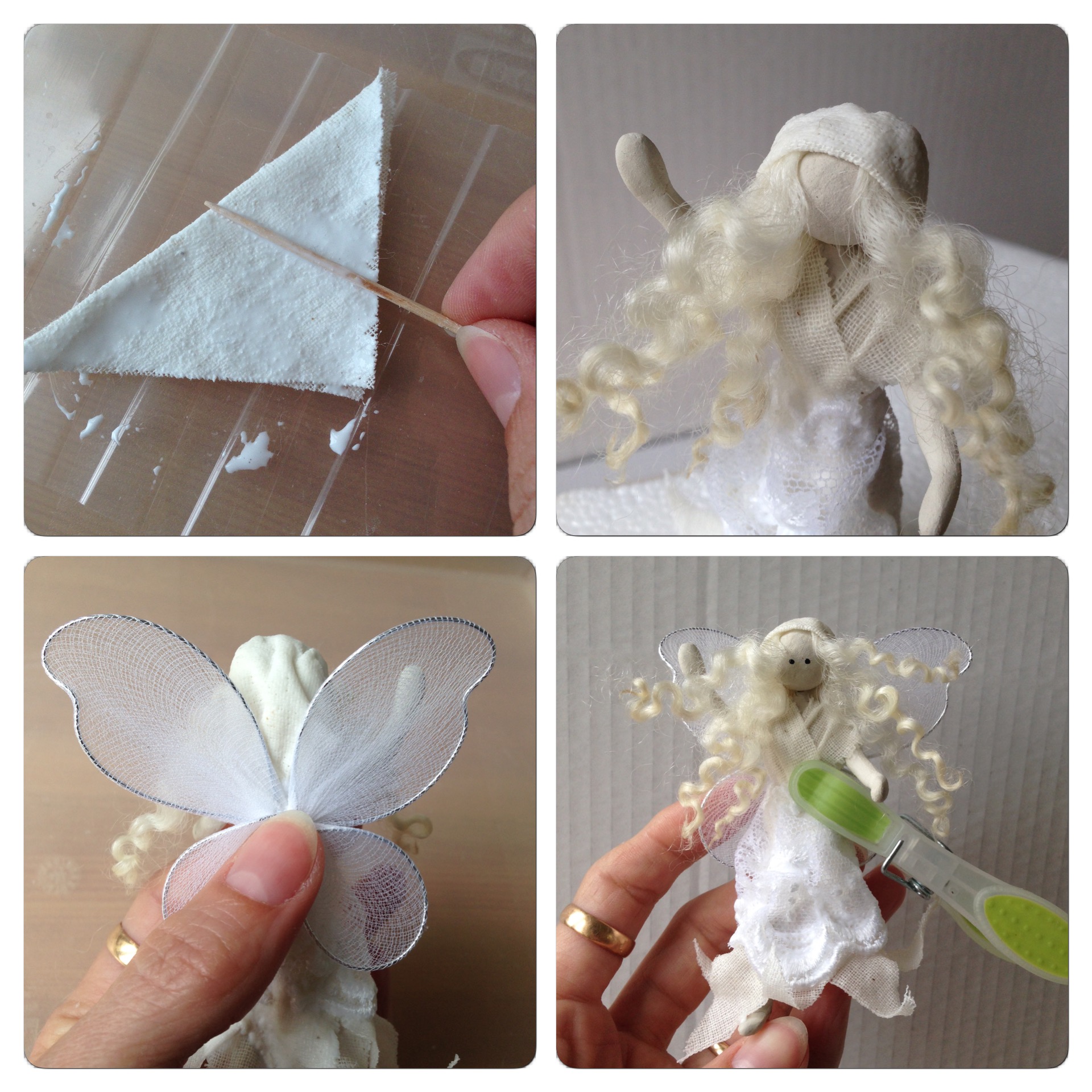 To get the proportions right, I began by drawing a stickman to match the wings in size. Based on that, I made an armature of wire that I dressed with clay. This is an air dry clay, so when I was done, I could just leave it overnight to dry and harden. After that it was time to test Paverpol, a fabric hardener which is used to sculpt with fabric. I cut out pieces of fabric and lace, smeared on the glue (yes, it’s very sticky) and draped them on the figure. It hardens as it dries and can even withstand outdoor conditions. For the hair, I picked out a couple of white locks of lamb´s wool from one of our sheep. I smeared on some Paverpol, let it dry a bit, pressed the fibres together and cut off the excess. This made the curls a bit easier to handle when I glued them to the head of the figure. Finally, the fairy got a headscarf (which hides the cut ends of the locks), two dots as eyes and wings glued to her back.