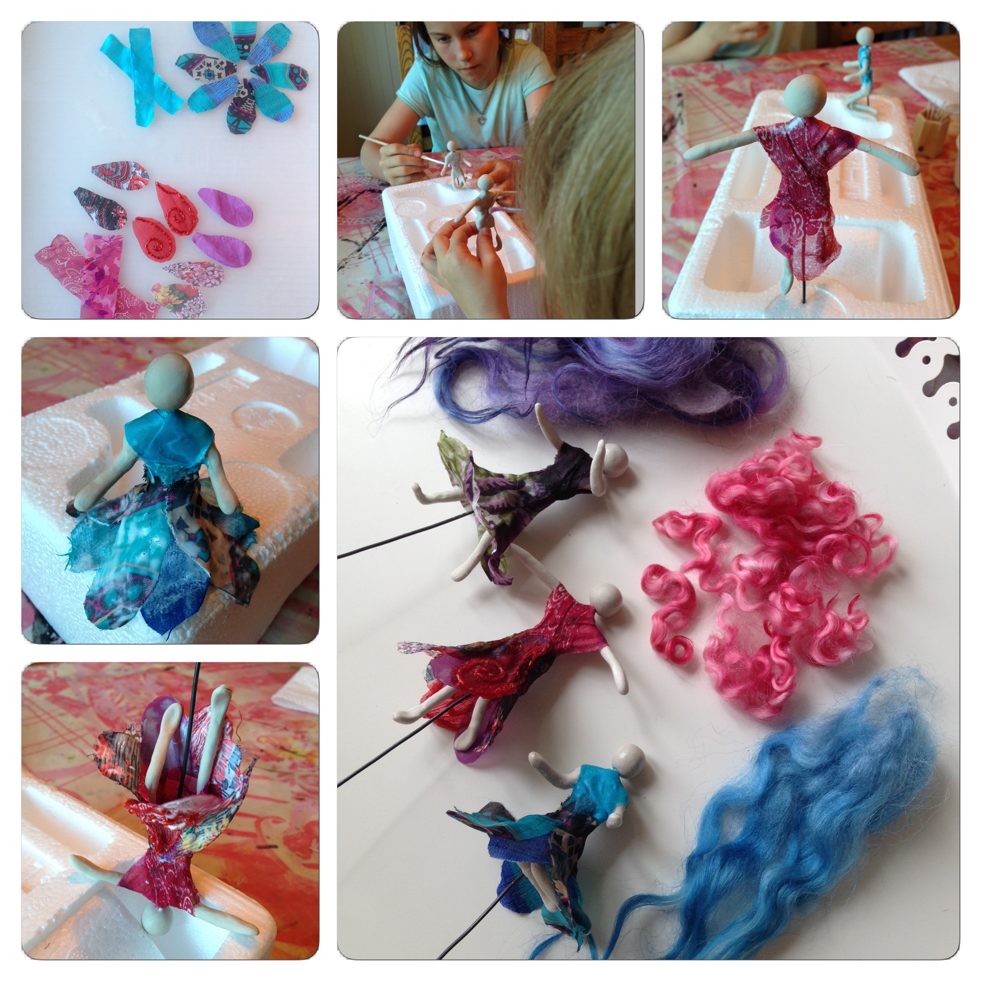 Nu när jag hade testat var det dags att göra älvor med barnen. Jag justerade stommen lite och la in en tjockare tråd (najtråd) i mitten så att älvorna skulle stå lite stabilare. Sedan fick barnen bestämma vilken kroppsställning älvorna skulle ha innan jag klädde dem med lera. Barnen valde förstås färggranna tyger och vi klippte ut kjoldelar i formen av blomblad. Älvorna fick också hår av färgad ull som matchade färgen på kläderna.