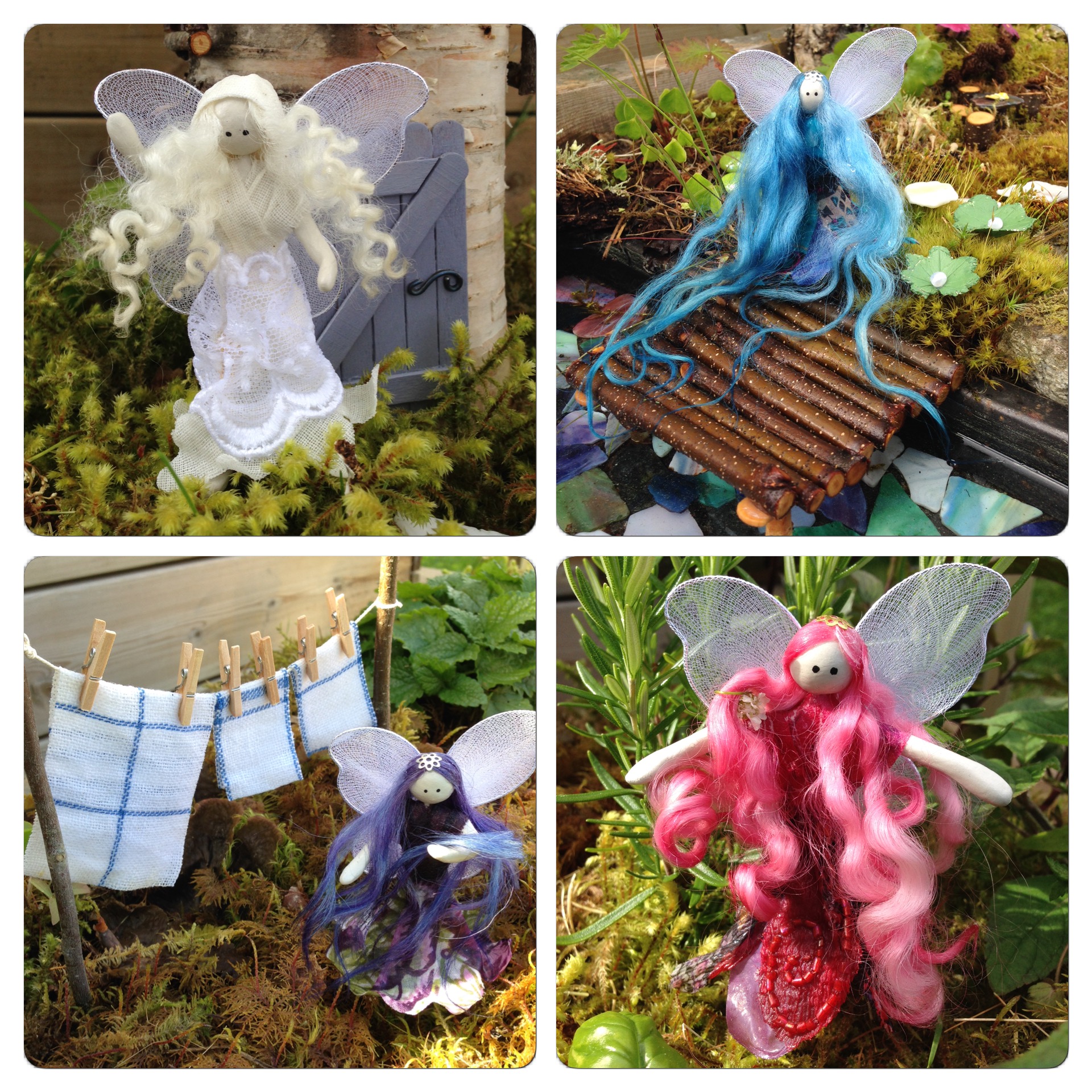 Den vita älvan är enligt barnen drottningen – trots att hon har ett huckle istället för krona. Den blåa är en vattenälva med långt vattenlikt hår. Hon sitter vid bryggan bredvid daggkåpor (gjorda av lera med en pärla i). Den rosa älvan är förstås en kärleksälva som dansar bland kryddväxterna. Sedan har vi den lila älvan som jag gjorde. Jag frågade barnen vad hon skulle ha för talang och då svarade min 10-åring att hon var nog bra på att hänga tvätt… Jaha. Ja, det är nog en klart underskattad talang. Det var ju bara att ställa henne bredvid en tvättlina då. Även älvor kan ju behöva tvätta ibland.