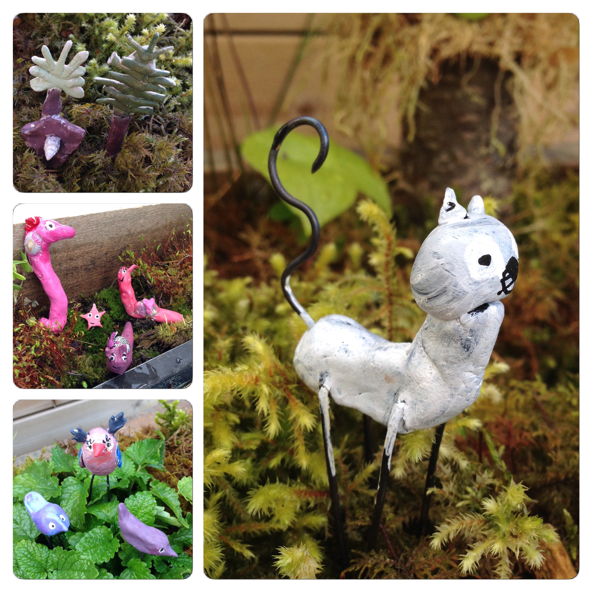 Barnen passade också på att göra lite andra figurer av leran. Det blev några små träd, sniglar, en sjöhäst, en sjöstjärna, några fåglar och en katt. Man kan som sagt ha mycket i en älvträdgård. Bara fantasin sätter gränser.