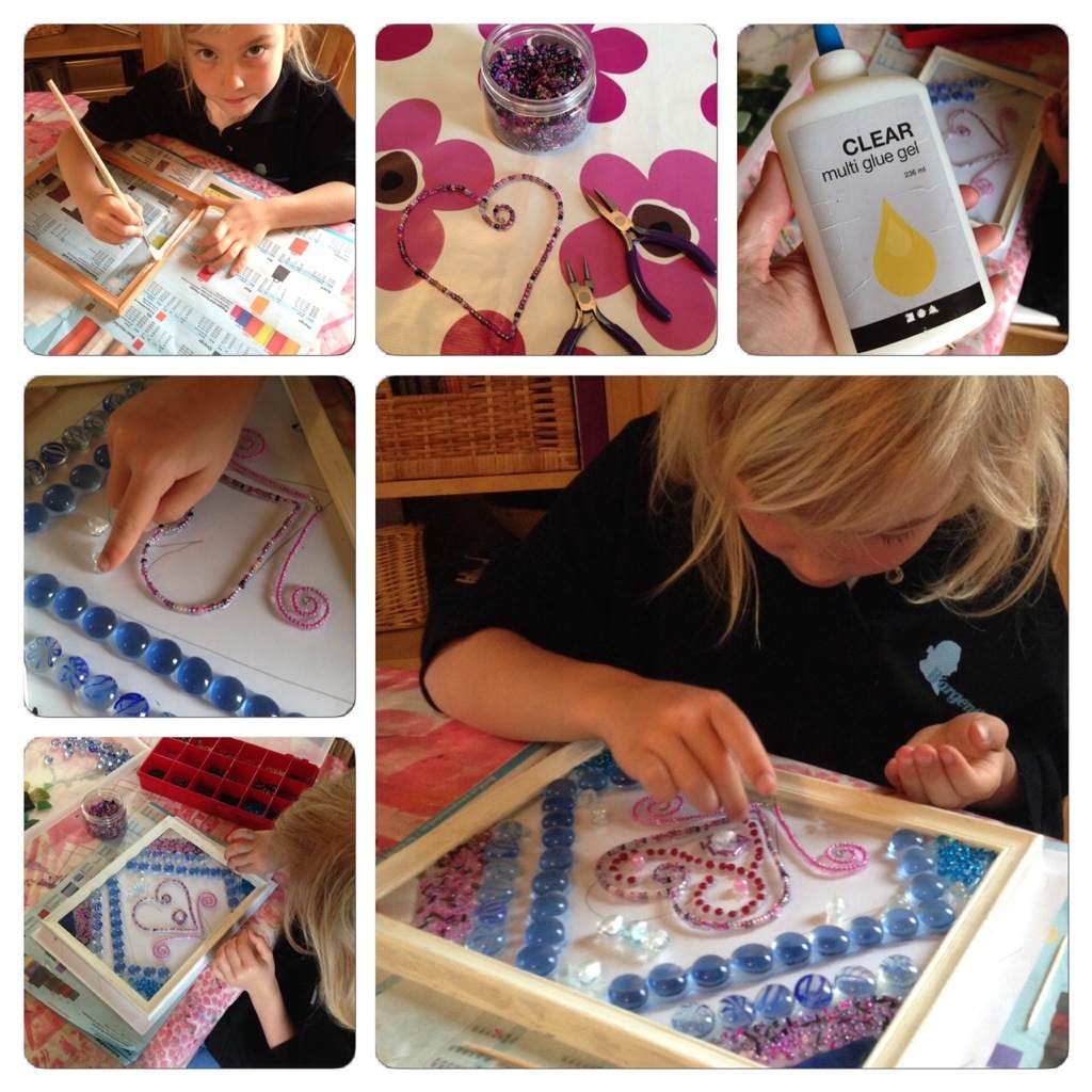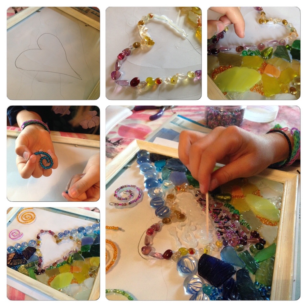 My 6-year-old is fascinated by symmetry. I helped her bend a piece of wire, which she had threaded with beads, into a heart. All the rest is her own doing, patiently gluing all the beads in place, following lines she drew on paper and put under the glass. My 10-year-old wanted colour contrasts, randomness and chaos. But when you looked closer, there would be a pattern. Bands of different colours with a heart that could be detected through deviating colours. And twirls on the other half, picking up the same colours. It was really interesting to hear her thoughts as she planned and worked with her mosaic.