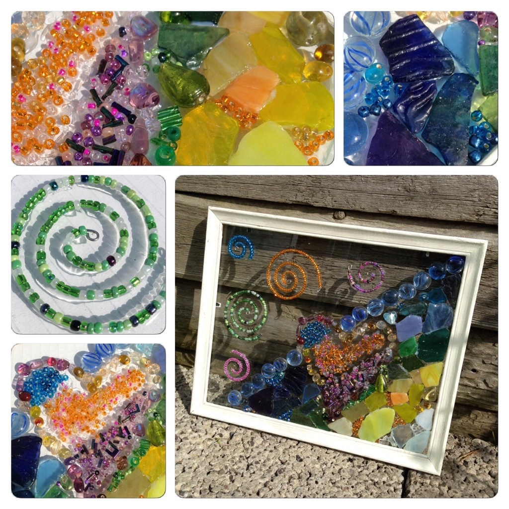 We had quite a few pieces of glass mosaic left over from when we made our fairy garden. Many of these pieces were translucent and I figured they may look nice glued to glass. I picked out two old picture frames with glass panels, and the kids started by painting the frames a neutral white. Then I got out the mosaic, glass stones, glass beads, wire and glue, and gave the children free hands. I considered using proper glass-glue, but that requires UV-light to harden, and on this particular day there was a lack of that as the rain poured down. With hindsight, I can say that the craft-glue I chose (Clear – Multi Glue Gel) worked well for this and was easy for the kids to use. Both the mosaic and the glue comes from Creativ Company.