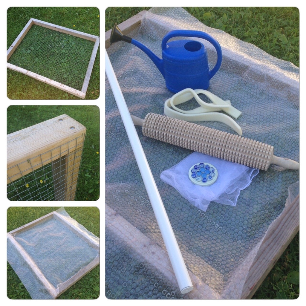 Jag råkade ha en ram (80cm x 100cm) med ett svetsnät i botten, som jag har gjort för att sortera ull i (som ett stort såll som släpper igenom skräp). I den lägger jag en bit bubbelplast som räcker över kanterna. Utöver det använder jag en bit tyll när jag blöter ner ullen, en liten vattenkanna med stril för att hälla vatten, några tovningsredskap (i mitt fall en kruskavel och ett burklock med pålimmade glasstenar), en gardinstång (ett kvastskaft eller annan rak pinne går utmärkt), något att binda med (elastiska nylonstrumpor är riktigt bra till det) och såpa eller tvål. Om ullen känns riktigt fet kan man ta till diskmedel, men ullen kan kännas rätt torr och sträv efter det. Ibland kan det vara bra att ha kvar lite smutsavvisande lanolin i fällen. Men det är en smaksak.