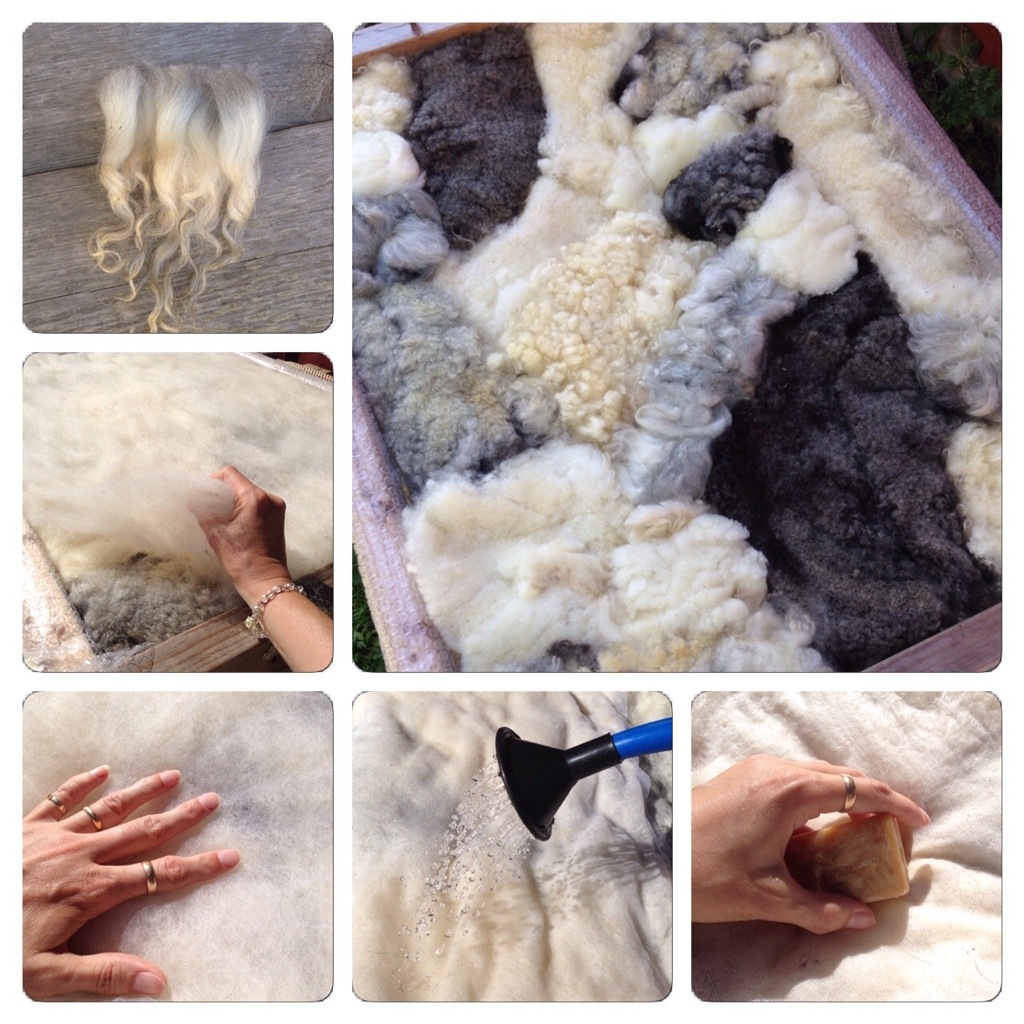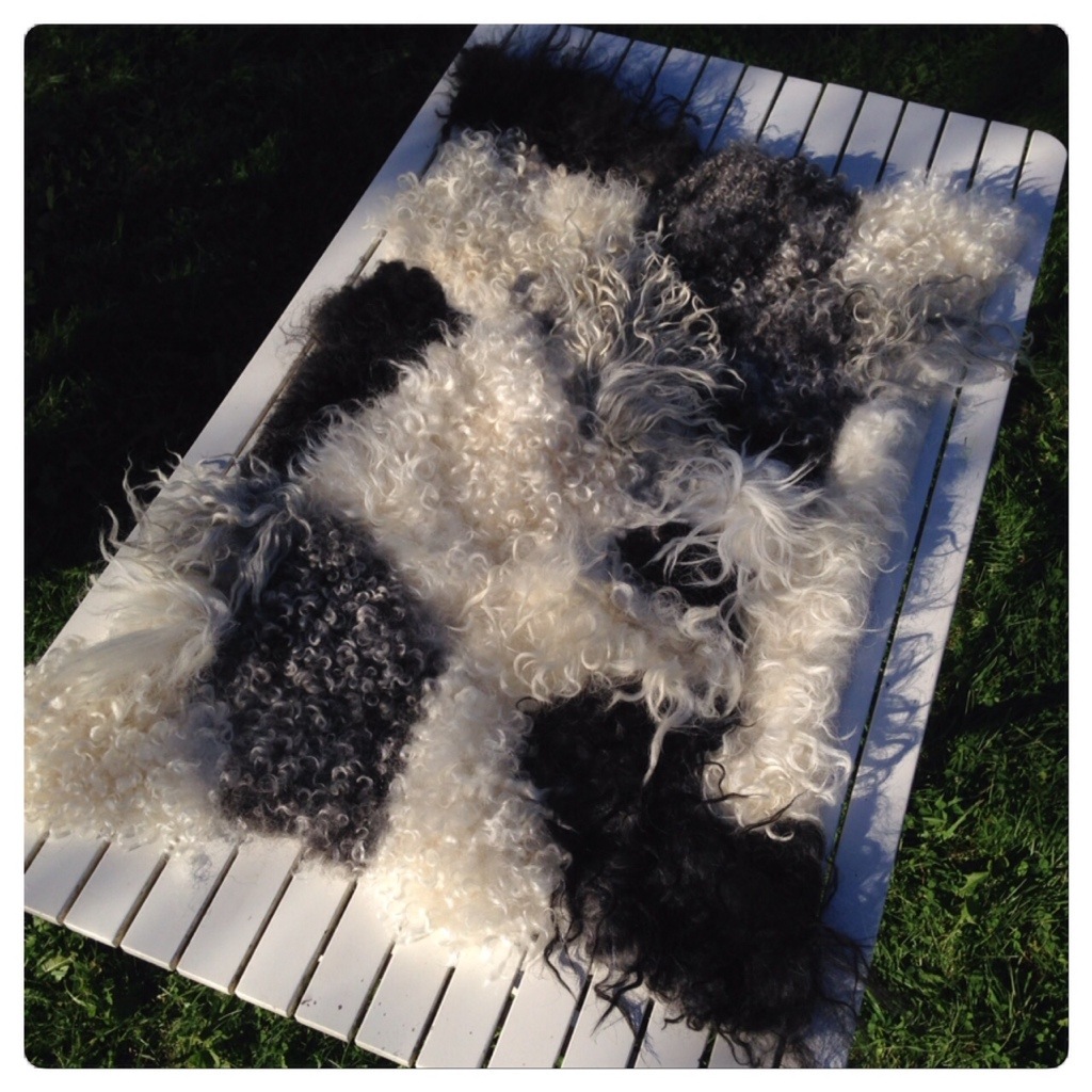 Ja, nedan ser ni resultatet när den torkat. Den är ca. 60 x 90 cm i storlek. En del lockar hade tovat in sig lite, men gick att lossa på när de torkat. Den här fällen är jag riktigt nöjd med. En salig blandning av ull från mina och grannes får. En hyllning till svensk ull! Visst är denna variation av färger, längder och struktur fantastisk?!