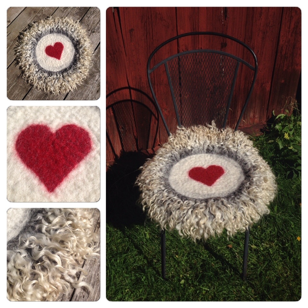 2. När sittdynan torkat, nåltovar jag fast mera lockar, med en liten förskjutning i placering för varje rad av lockar. Eftersom dynan kändes lite tunn la jag också på lite mer kardad ull i mitten, vit ull denna gång. Och för skojs skull nåltovade jag också fast ett rött hjärta, utklippt av nålfilt som jag köpt från filtmakeriet.