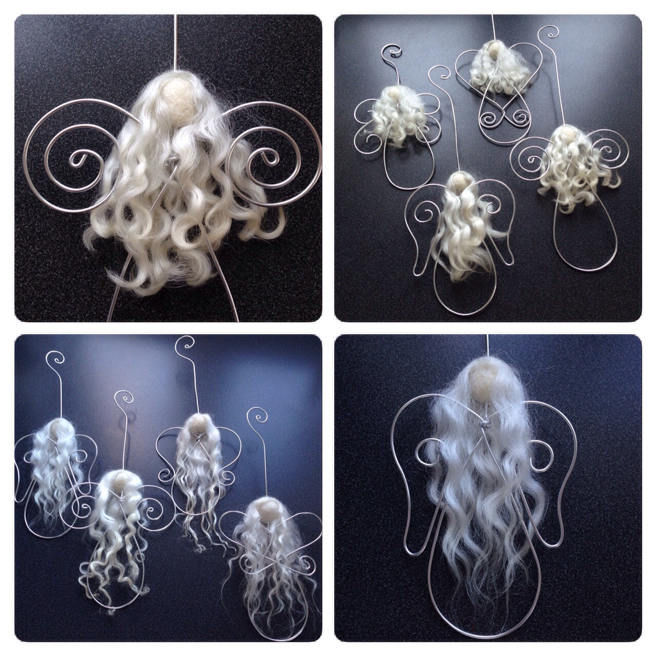 I made a couple of different bodies with wings from aluminium wire. The heads are wet-felted balls, that I could needle-felt the ”angel hair” on. Then I just had to fasten the heads to the bodies and a add a hook, made out of wire, to be able to hang the angels. I think they will look great on the Christmas tree, or hanging in windows. And I do think that the locks are shown off nicely in these angels, in all their simplicity.