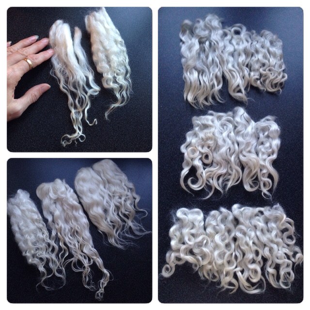 När man sitter med en näve ljusa, långa och glansiga lockar kan man inte annat än att tänka på änglahår. Lockarna på bilderna nedan kommer från klövsjöfår (till vänster) och gotlandsfår (till höger). Det var ju bara tvunget att bli några änglar av dessa ljuva lockar.