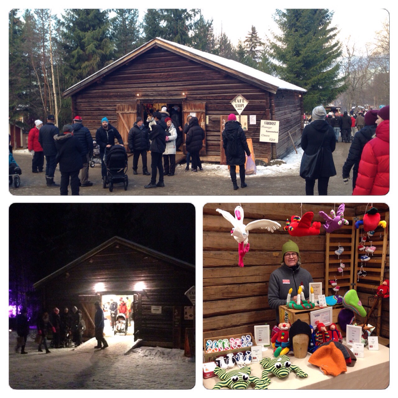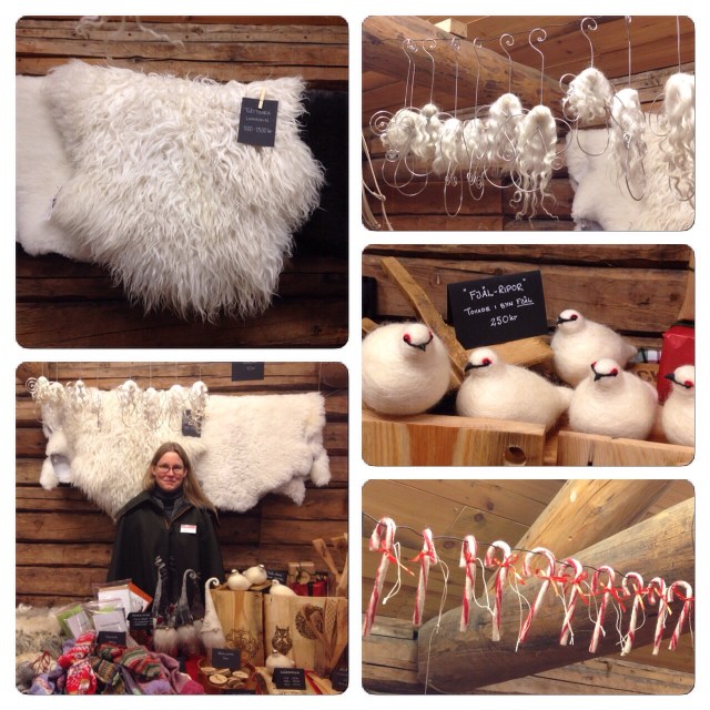 The photos above are only from the wooden barn where we were placed, together with 9 other vendours. They were selling delicious and locally produced cheeses and sea buckthorn products, beautiful carved wooden horses, wire art and jewelery, needle-felted figures , warm gloves sewn from felt, sheep pelts, hand-woven rugs, sewn figures, and various knitted items. Such a wonderful mixture of crafts and local produce and that was just in ”our” barn! To raise the Christmas spirit further, we were also visited by a couple of musicians who performed for us.