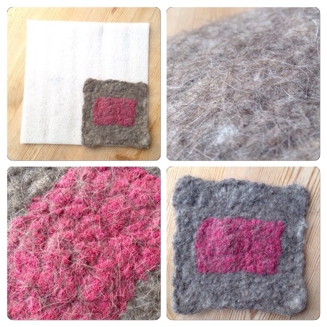 Och det gick ju alldeles utmärkt att tova jakull. Den krympte snabbt ner till en kompakt fyrkant på 10 cm x 10 cm, och tyget har tovats fast ordentligt. De grövre fibrerna ger det tovade stycket ett hårigt utseende och drar ner mjukheten, men jag kan föreställa hur lyxigt mjukt ren bottenull från jak måste vara.