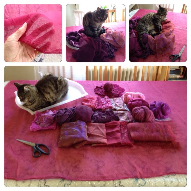 Att kombinera olika färger och material är väldigt kul, men också en utmaning. När jag har kommit så långt att jag bestämt vad jag ska tova och i vilken grundfärg, så återstår beslut om nyanser och tyger och eventuellt andra fibrer. Sånt kan ta tid. Och även om katten Smilla gärna gör mig sällskap så är hon sällan till någon hjälp i beslutsvåndan. Hon gillar allt som är mjukt.