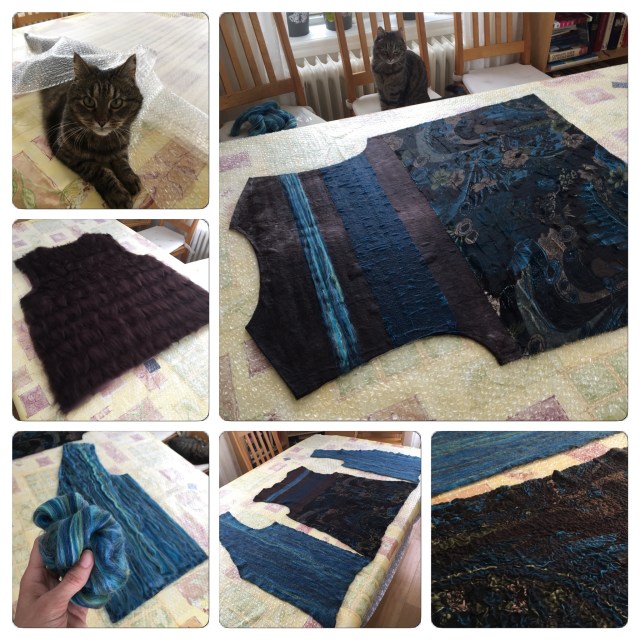 Jag tovade delarna (baksida och två framstycken) var för sig, av merinoull med viskos- och sidentyg som dekor på baksidan. Katten (på bilderna nedan) har ingenting med tovningen att göra och är inte särskilt hjälpsam, men likväl ett trevligt sällskap.