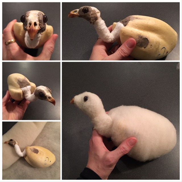 Wet-felting followed by more needle-felting. And theft of feathers (some tail feathers and outer wing pens) from some specimens we had in the freezer.