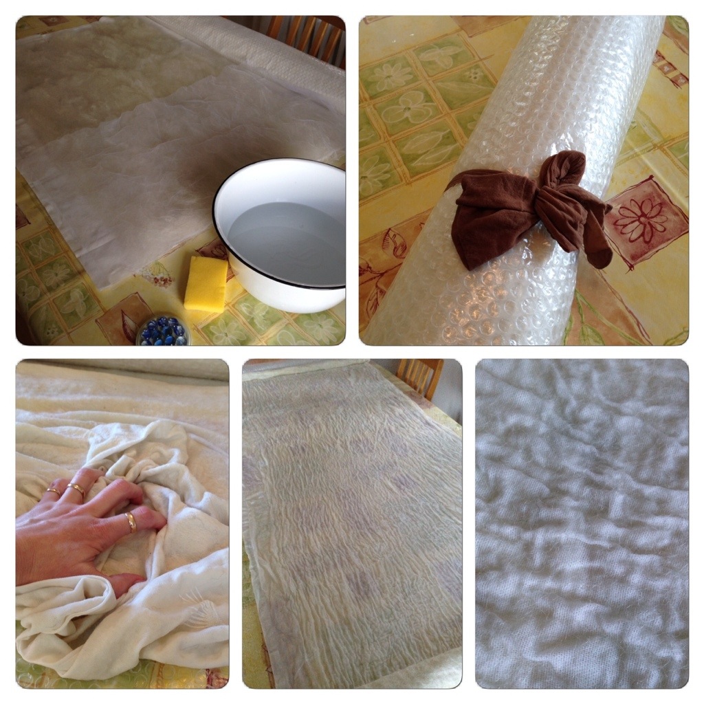 Sedan var jag också tvungen att testa lite merinoull, som jag har fått i utbyte mot råull av likasinnade fiberentusiaster. Här la jag först ut en bit tunn bomullsväv och på det några tunna remsor av ull. Den här ullen är så mjuk, så det känns nästan inte som ull – åtminstone inte om man är van vid att ull ska stickas lite (enligt min mor är det just stickigheten som får igång blodcirkulationen och som gör att man känner sig varm när man bär ylleplagg). De små, tunna merino fibrerna syns knappt på andra sidan tyget, trots att tyget uppenbarligen har tovats in och skrynklats ihop. Så annorlunda från den grövre ullen jag är mer van att tova.