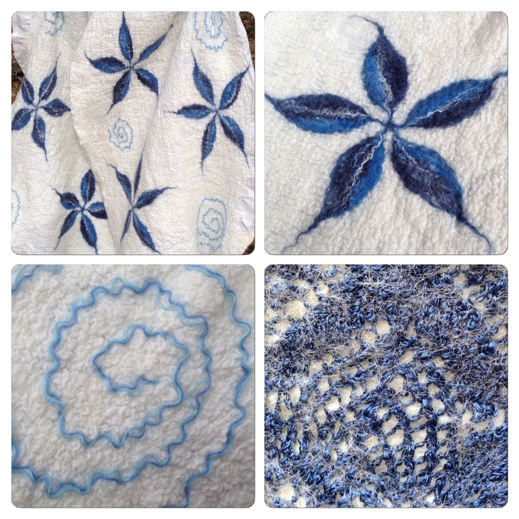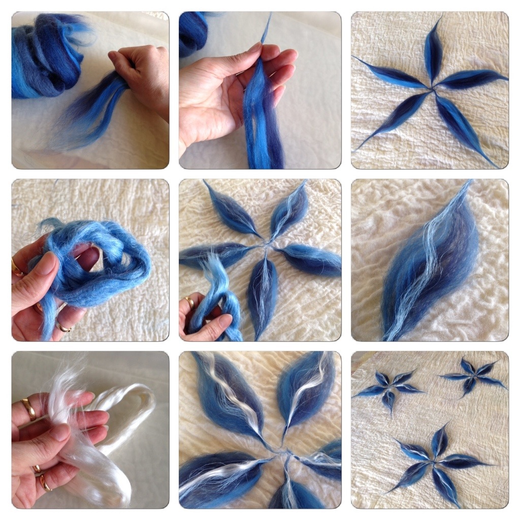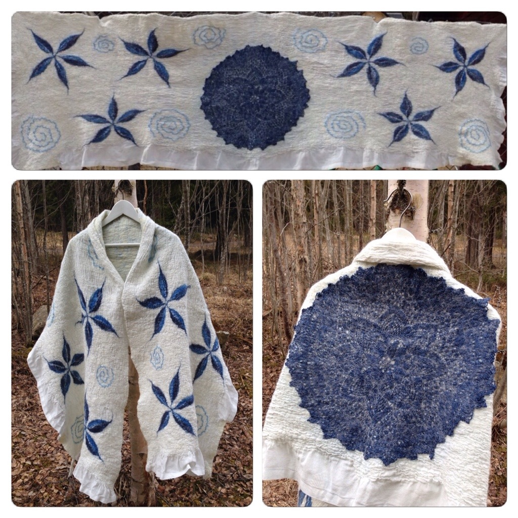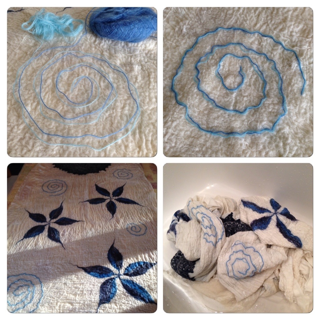 Slutligen gjorde jag en enkel blomma av merinoull på silkestyg. En sjal behöver ju inte ha ett heltäckande lager av ull – man kan ju lägga ut ull enbart som mönster/former med kala partier av tyg däremellan. Jag fascineras verkligen av hur lite av ullen som syns på andra sidan av detta tunna, vita silkestyg, trots att det tovats fast.