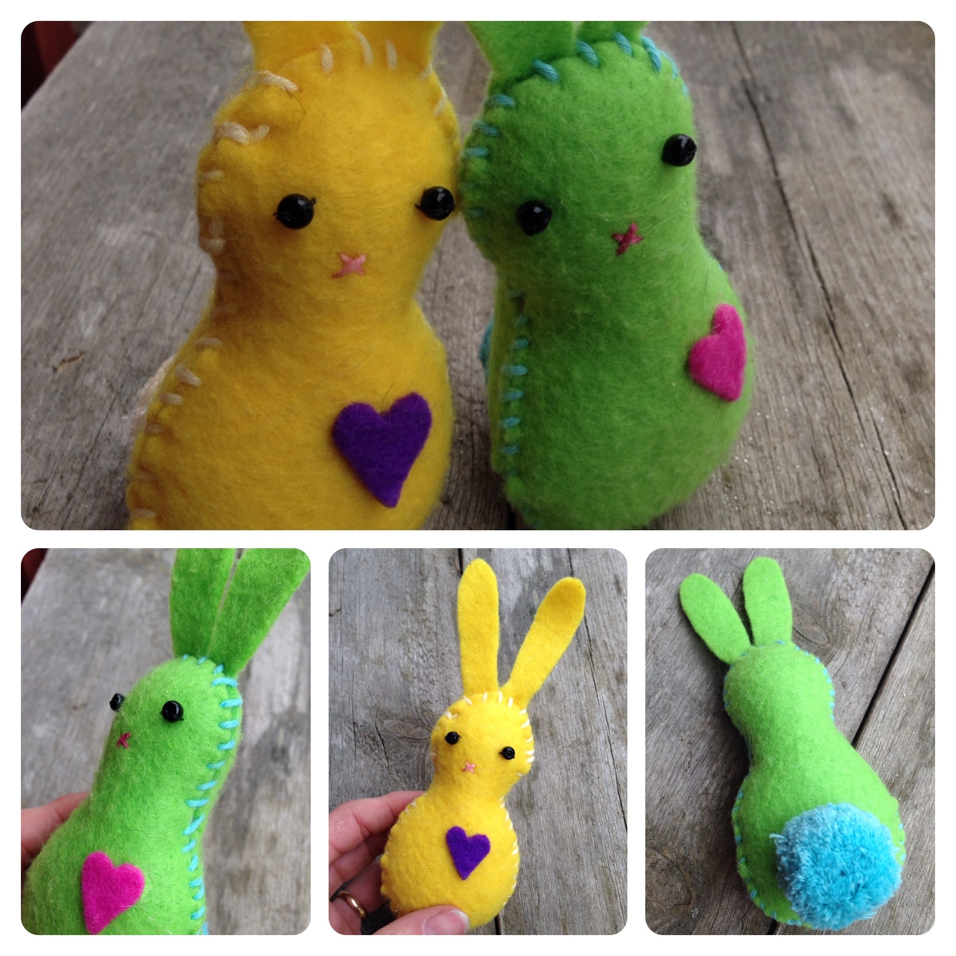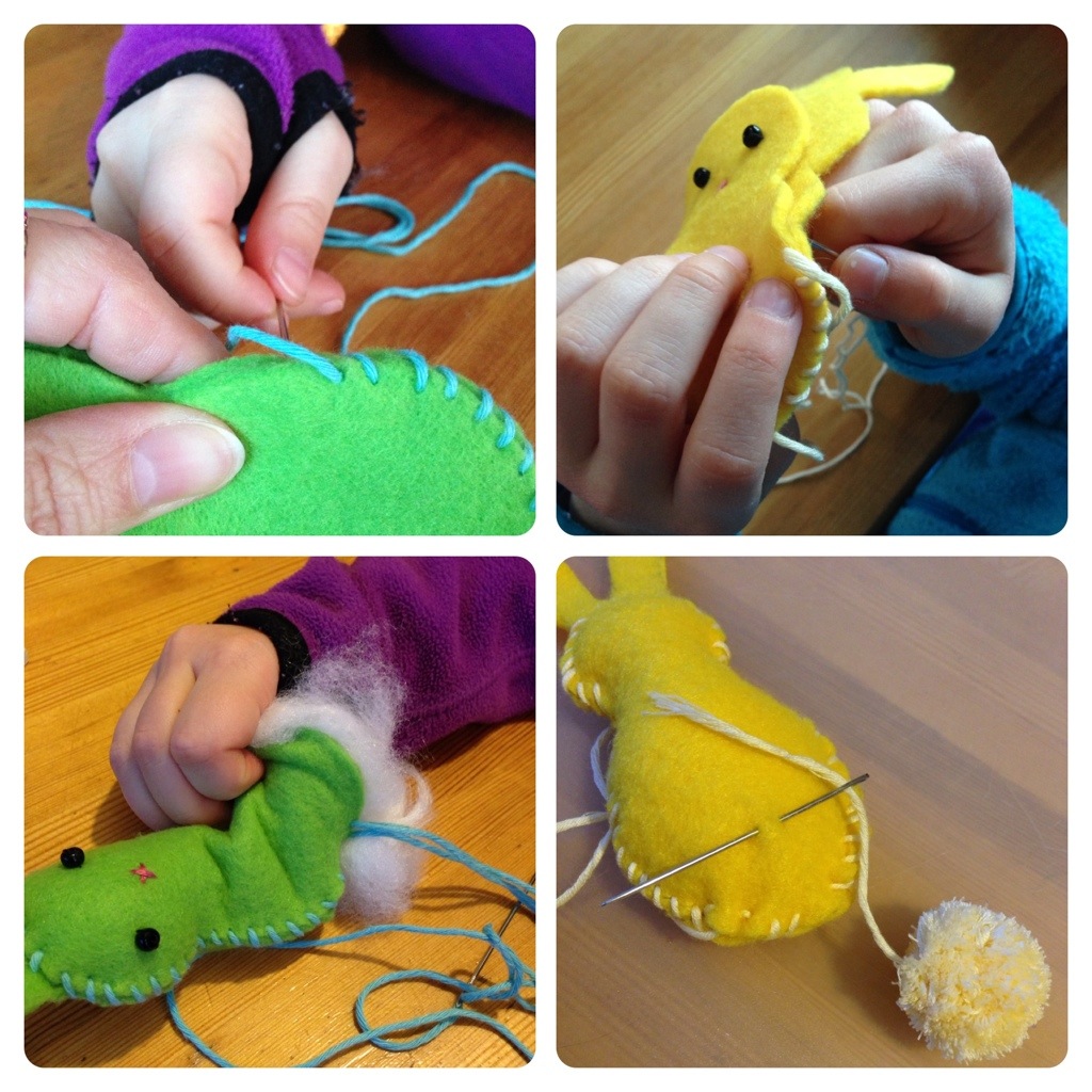 Finally, the most fun part – decorating the vests. We recently dyed locks of wool with food colouring (previous post) and wanted to use them for something. So my daugthers chose their favorite colours and I needle-felted the locks as collars on the vests. I also needle-felted hearts using a cookie-cutter and needle-felted these to the vests.
