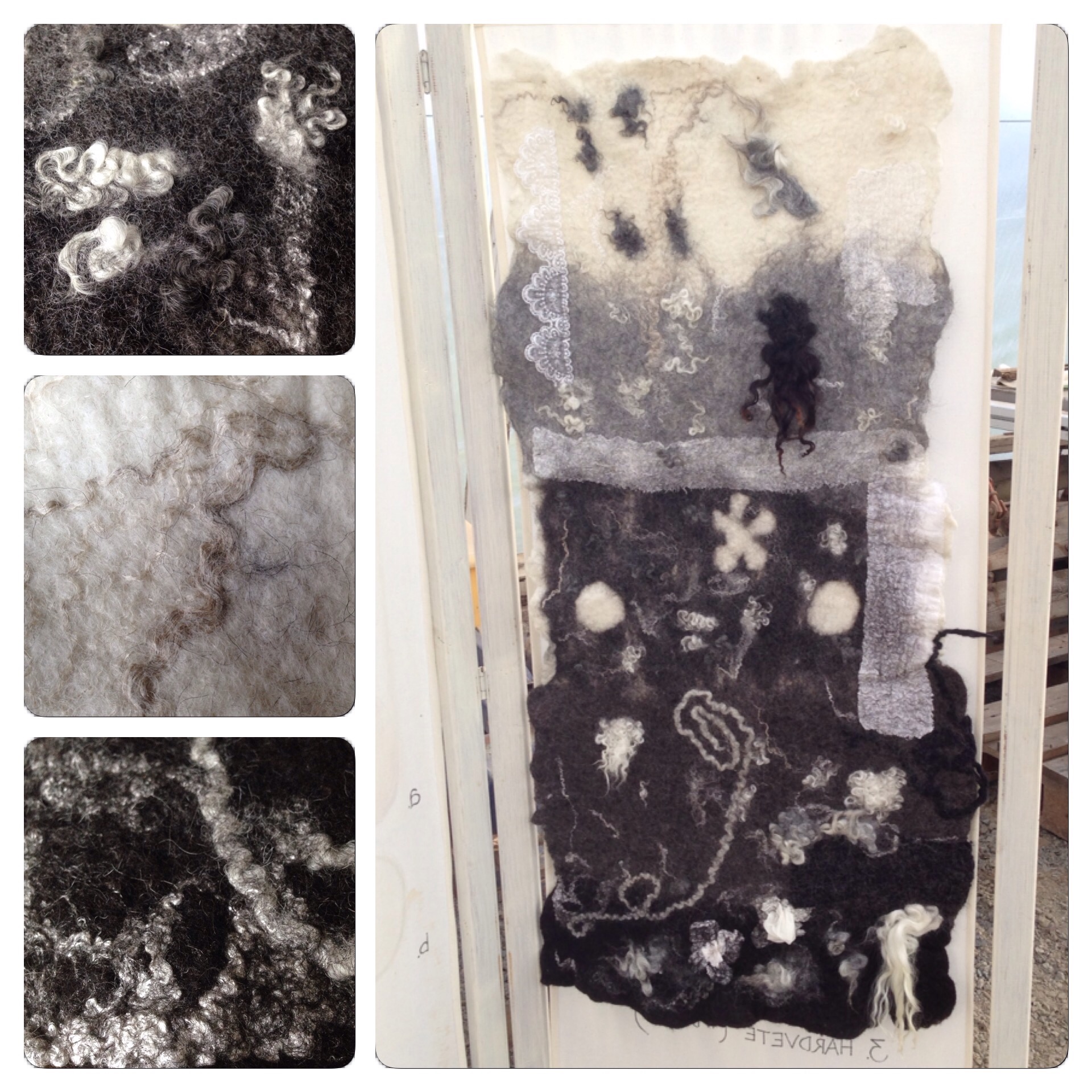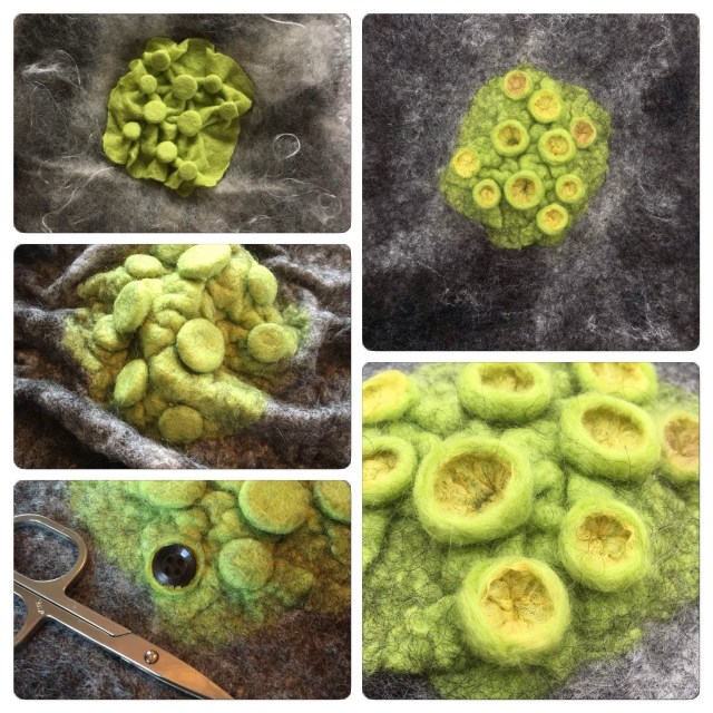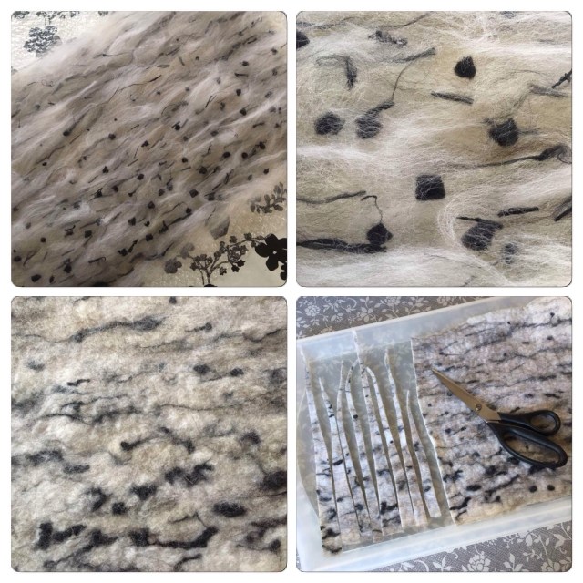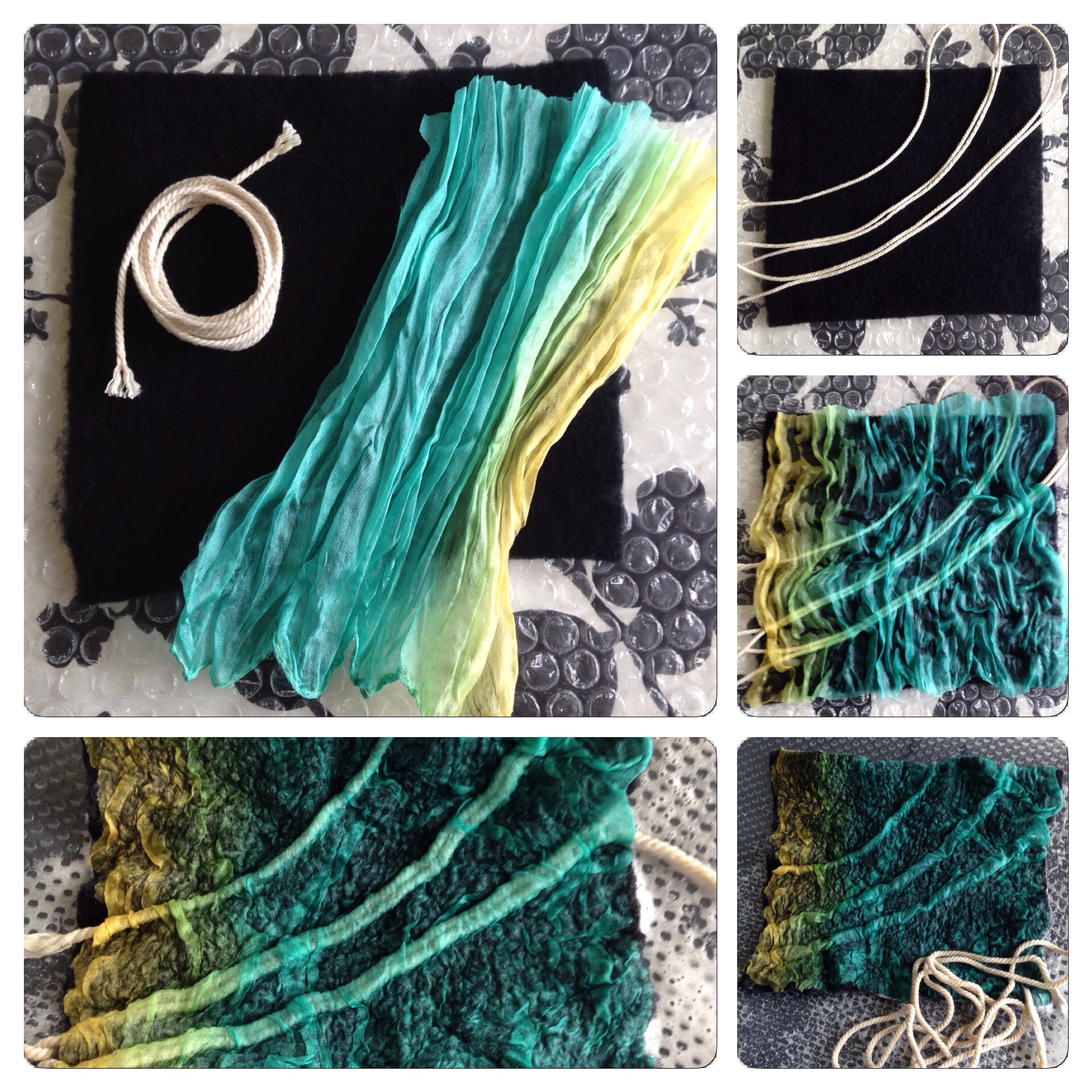 On a third, we laid out a thick cotton string between the wool and the silk fabric. I left the string in place almost until the end of the felting process, before I pulled them out.