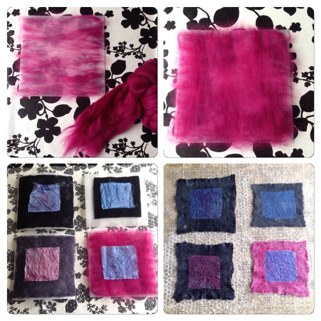 While I was at it, I also made a sample with merino tops, two thin layers in different fibre directions. A added a piece of silk fabric to each sample, and felted all four samples the same way.