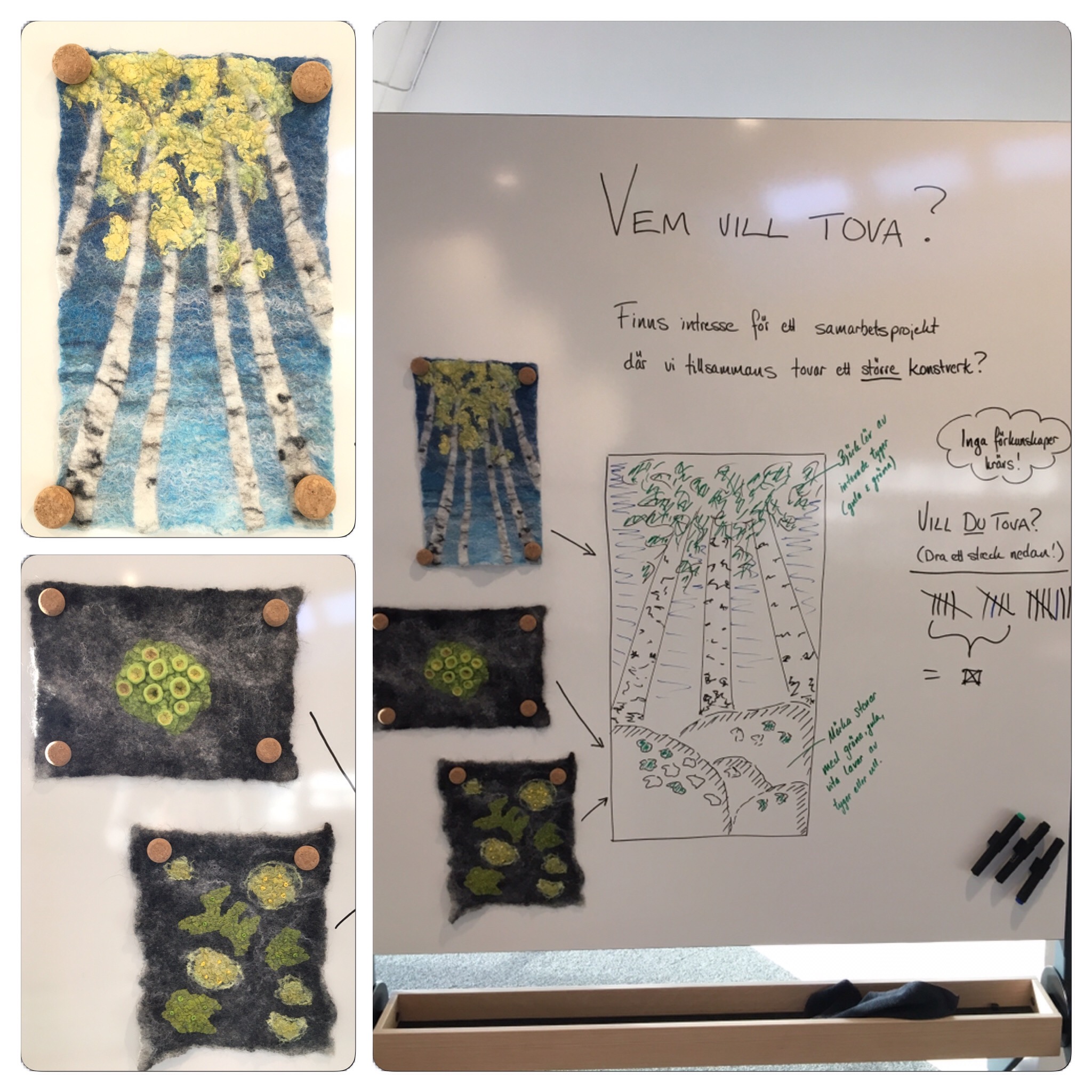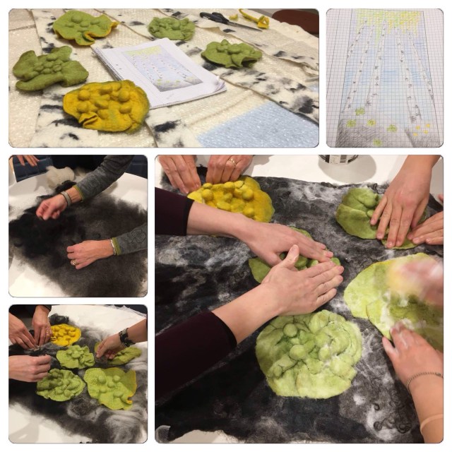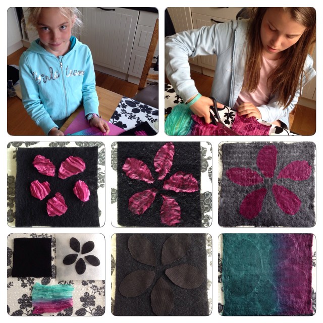 Efter det ville jag leka lite med mönster och tog barnen till hjälp. På en bit nålfilt la vi ut bitar av sidentyg klippta i formen av blomblad. På en annan klippte vi ut blomblad i ett tjockt men glesvävt bomullstyg och la dessa mellan ullen och sidentyget.