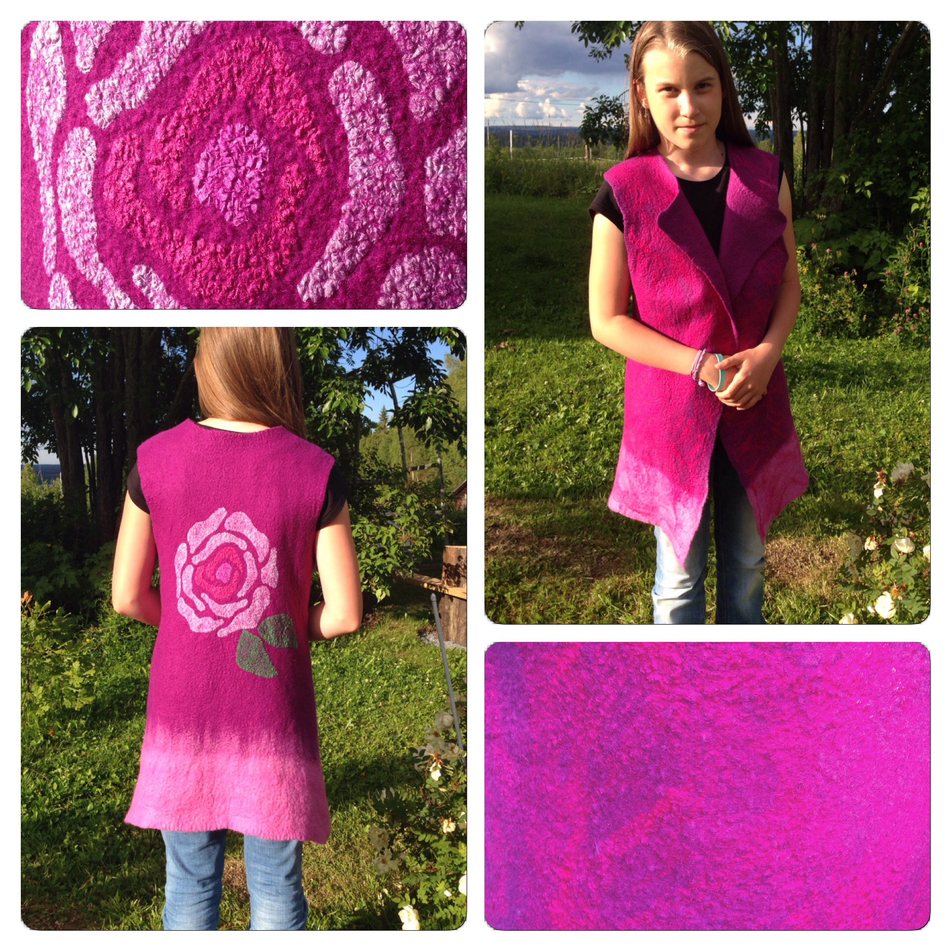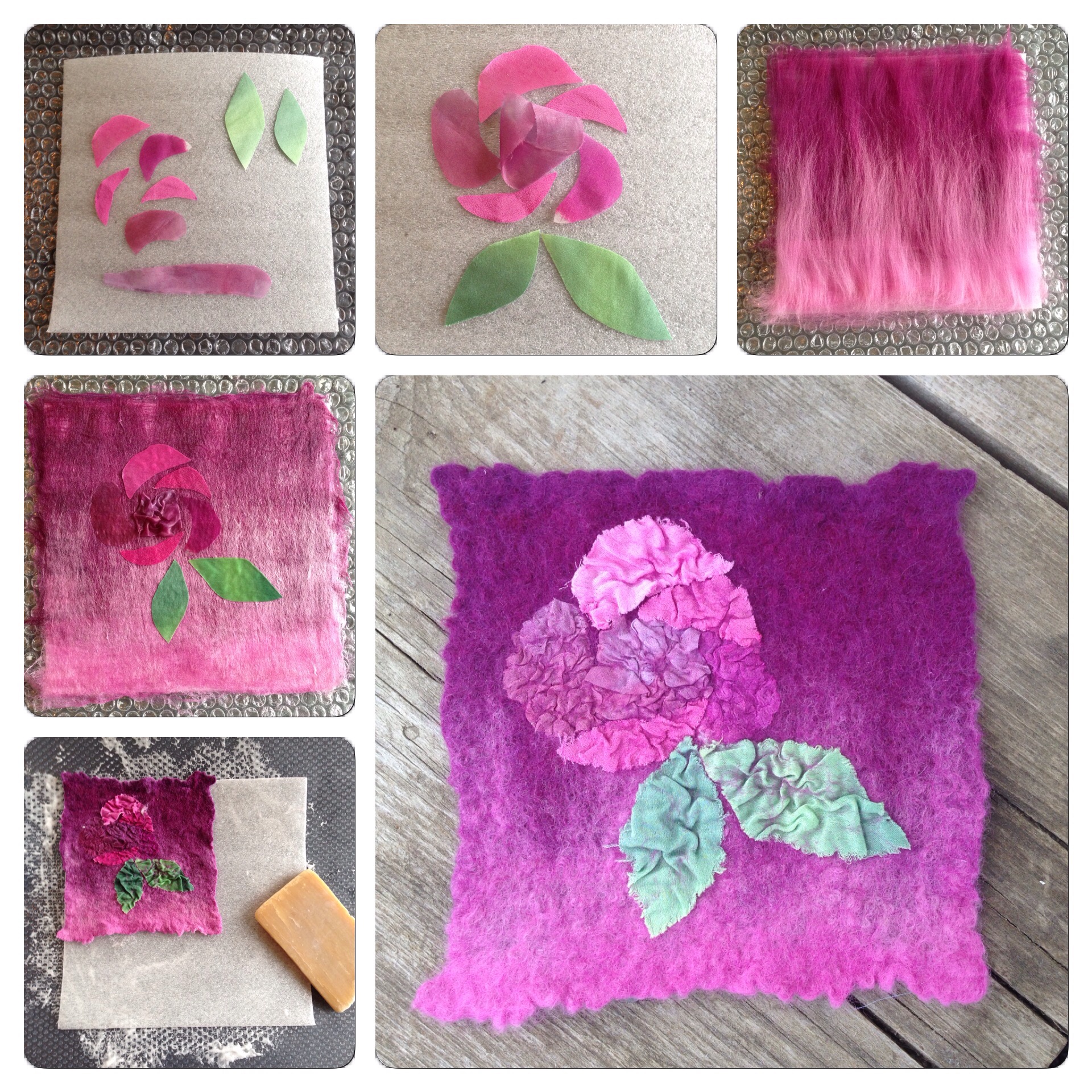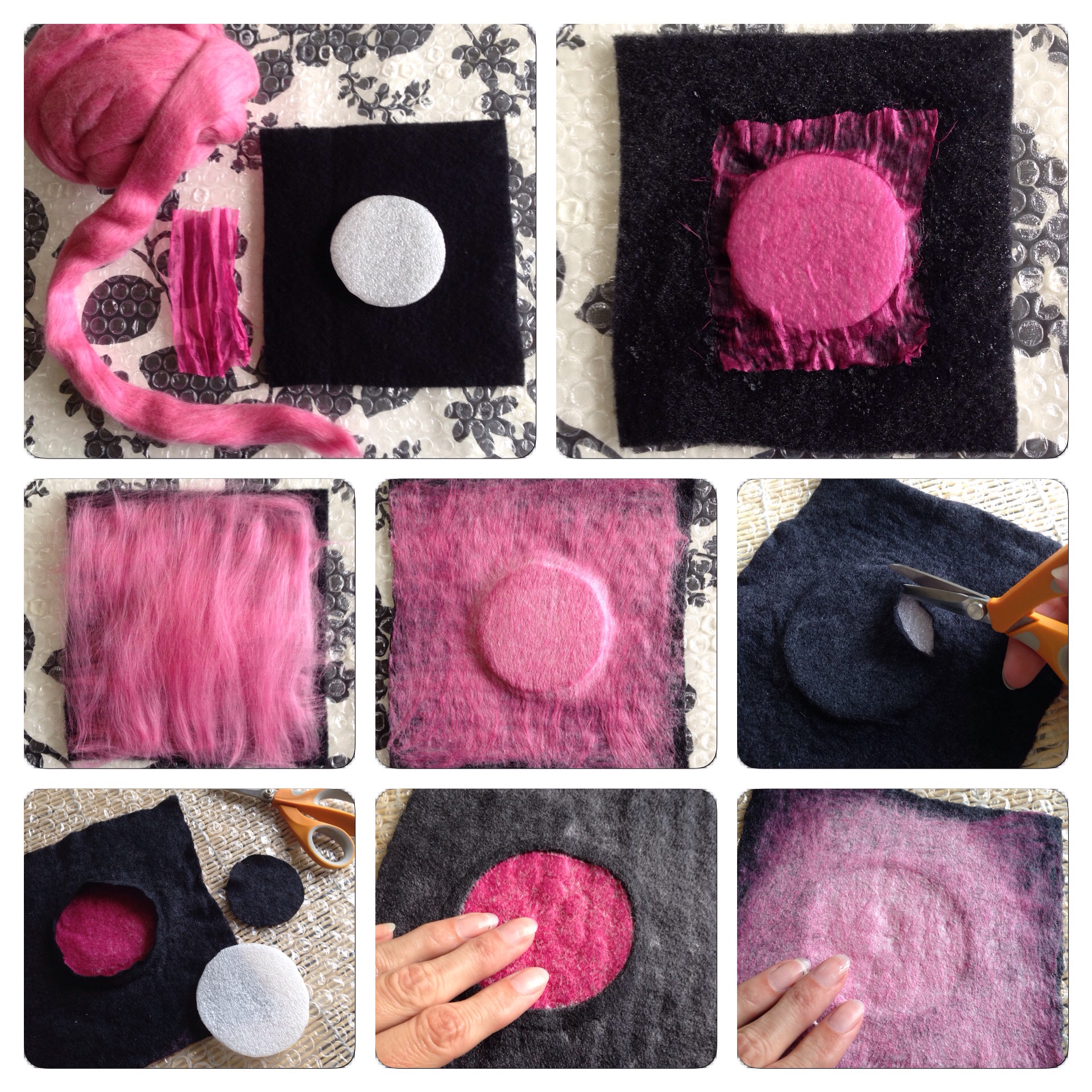 På den fjärde biten nålfilt la vi på en cirkel av plast och på det en bit sidentyg och två tunna lager rosa ull. Halvvägs genom tovningen (innan valkningen) klippte jag ett runt hål och tog ut plasten (som har hindrat de två lagren av ull att tovas ihop just där).