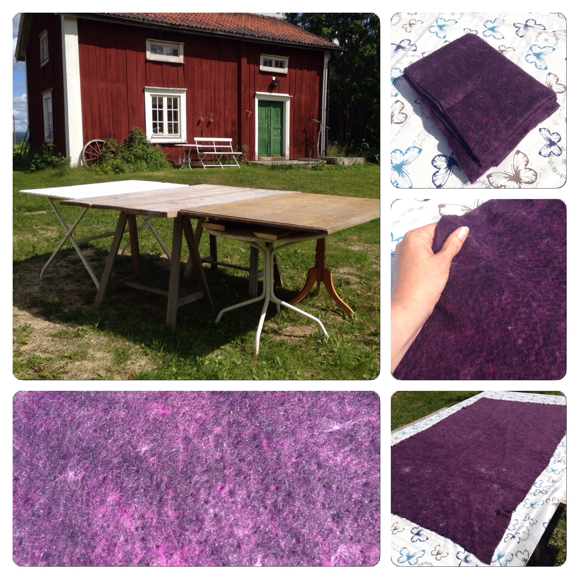 På Fårfesten i Kil köpte jag bl.a. mörklila nålfilt av Christina Skovmose (Skovmose by hand) och ett stycke sidentyg, som jag ännu inte gjort något av. Den väldigt mjuka nålfilten av 80% merino och 20% silke finns att köpa via hennes webbutik och Christina förklarar också på sin hemsida hur hon brukar dra ut (glesa) nålfilten på längden när hon använder den. Eftersom jag aldrig har tovat med nålfilt av merino tidigare kändes det säkrast att börja med en provlapp. Jag klippte ut en bit på 15 cm x 15 cm och testade att sträcka ut den både på längden och bredden till 20 cm x 20 cm.
