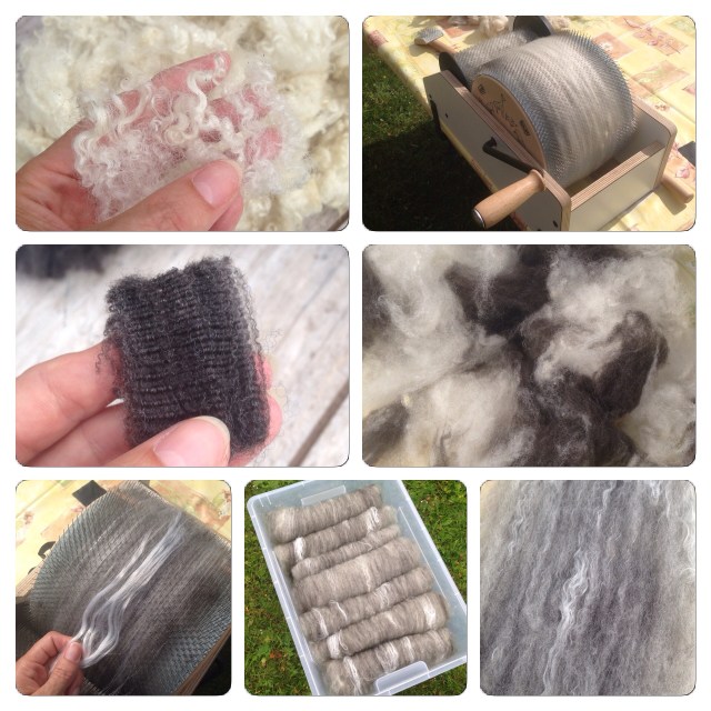 Och när ändå höll på gjorde jag även en provlapp av enbart kardad/kammad merino (det som säljs som tops), två tunna lager i olika fiberriktningar. På vardera provlapp la jag på en bit sidentyg, och sedan tovade jag alla fyra lappar på samma sätt.