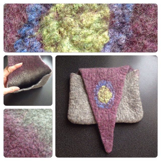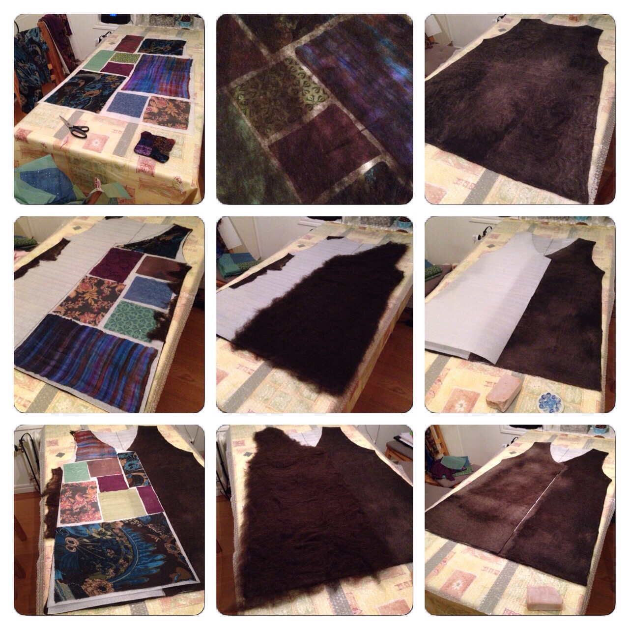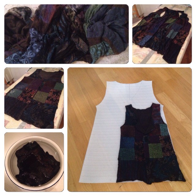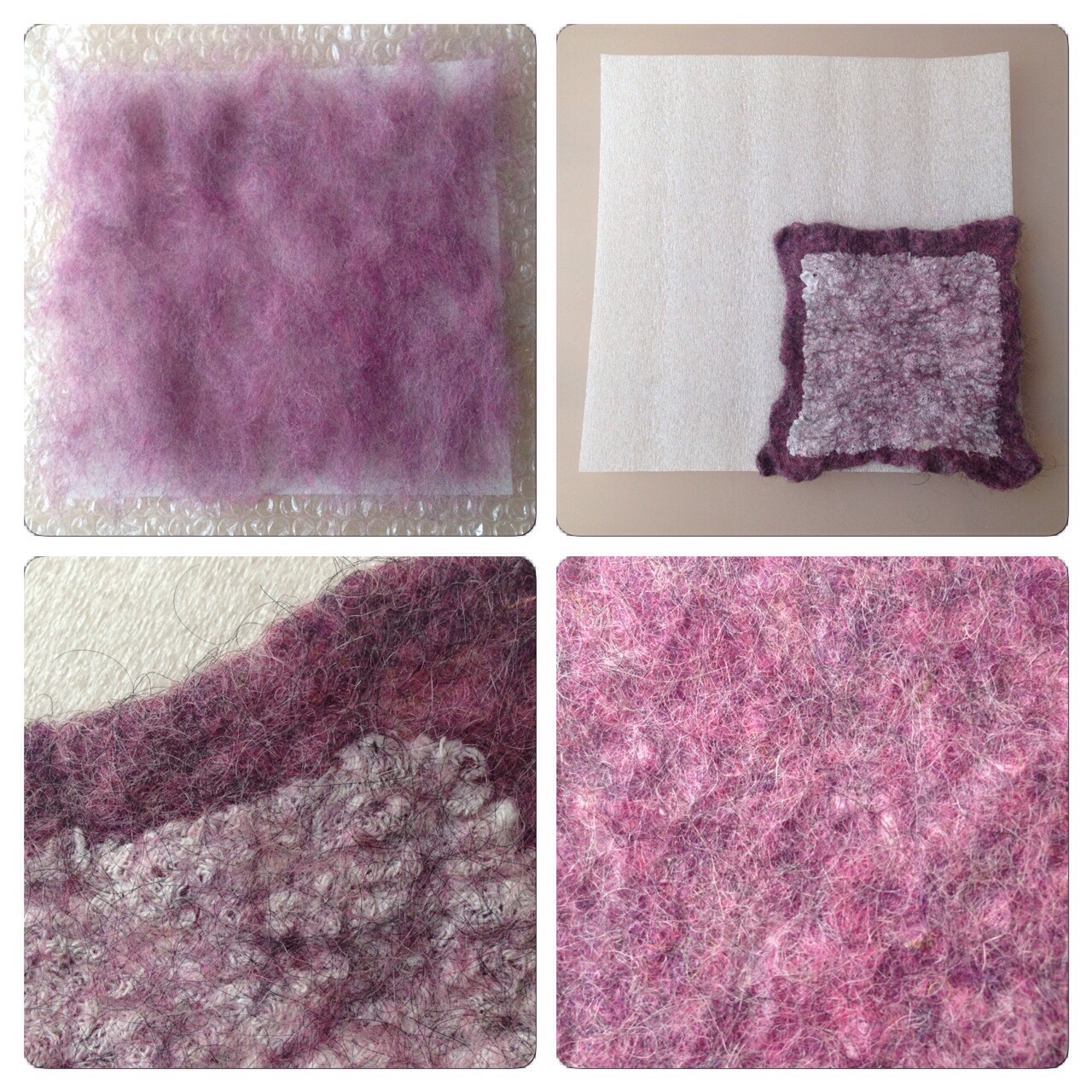 Själva tovningen var min uppgift. Nu hade jag dessutom en 6-åring med höga förväntningar på resultatet. Men det gick bra, trots en stor variation i placeringen och mängden av ull utlagd på tyget. Den färdiga sjalen blev ju riktigt rolig, och dottern är helnöjd med sin skapelse.